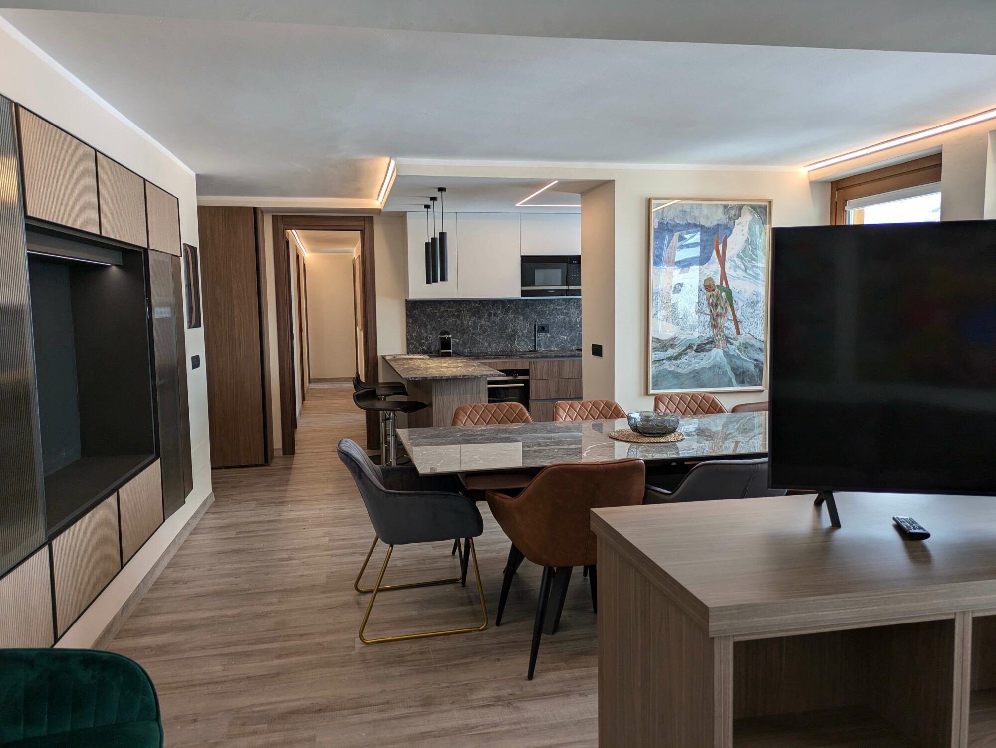 Denne rummelige og totalrenoverede lejlighed på ca. 130 m² har plads til op til 8 personer og ligger ideelt i hjertet af Cervinia – kun 200 meter fra Cretaz-lifterne og få skridt fra butikker, barer og restauranter.