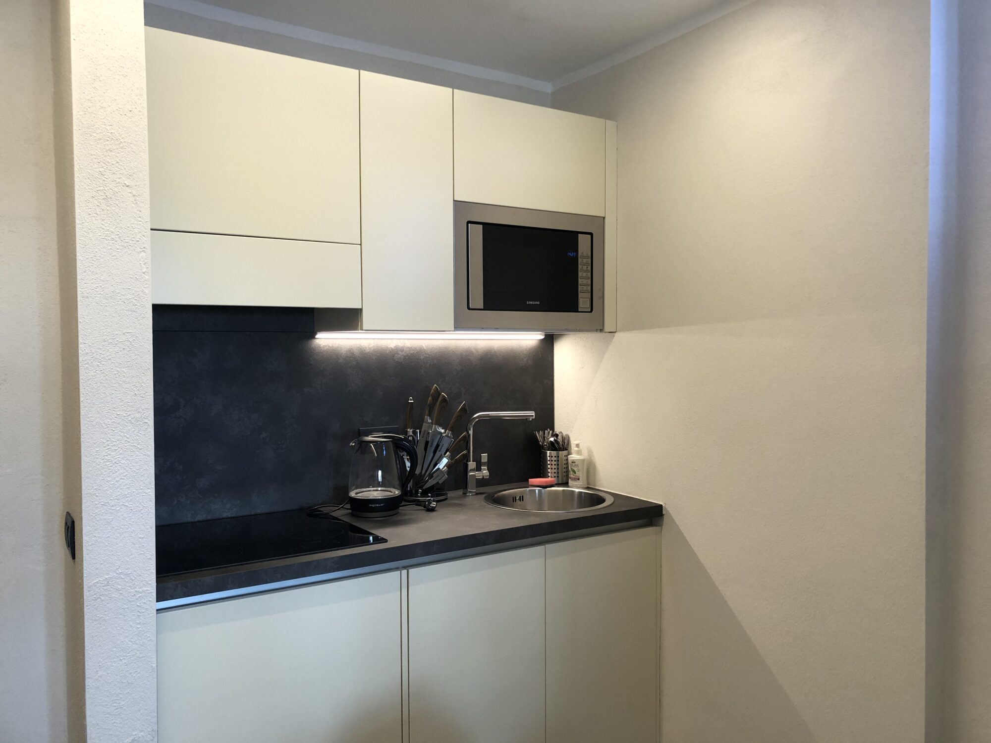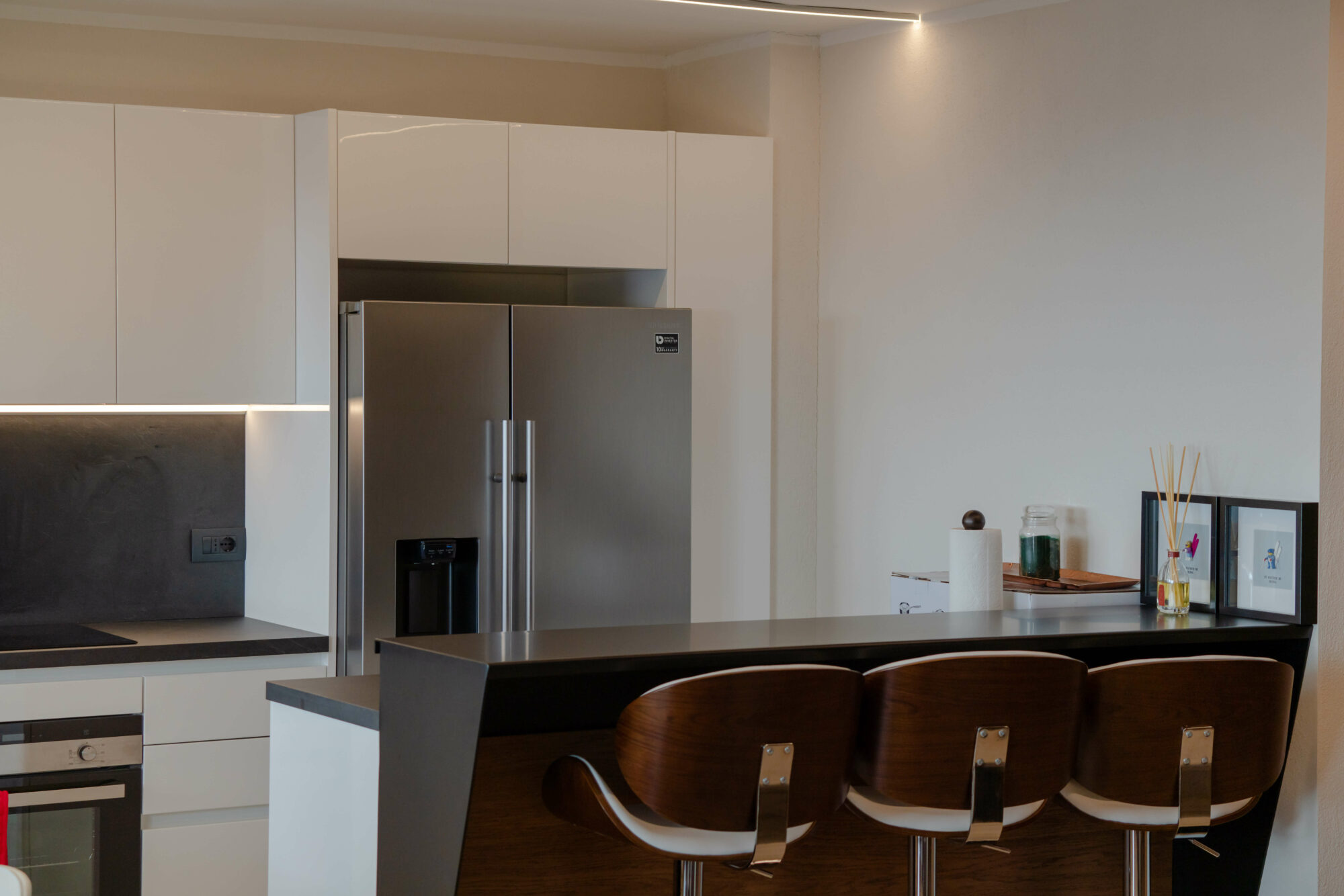Lejligheden byder på tre soveværelser og tre badeværelser, alle med walk-in bruser Køkkenet er fuldt udstyret, herunder induktionskogeplade med integreret emhætte, ovn, mikroovn, opvaskemaskine, Lavazza-maskine og raclette-sæt – perfekt til hyggelige aftener.