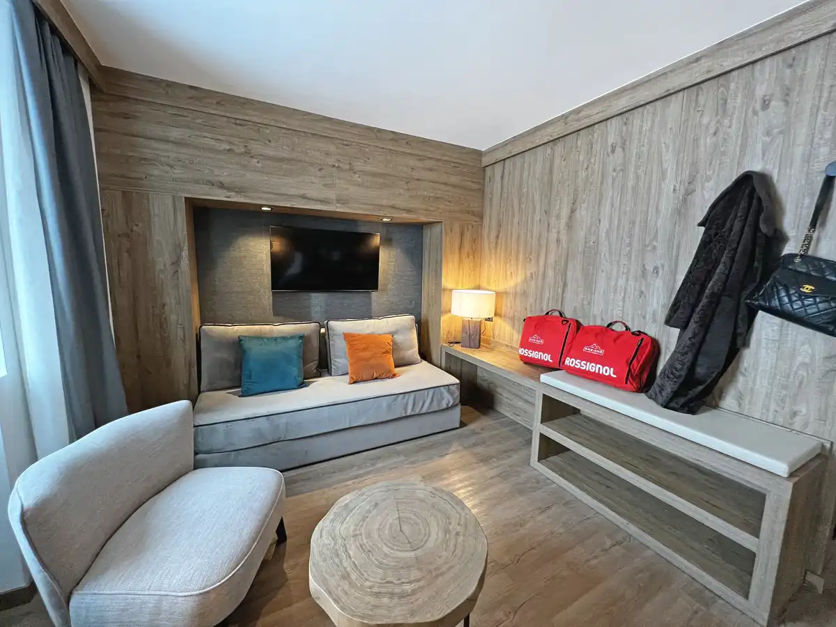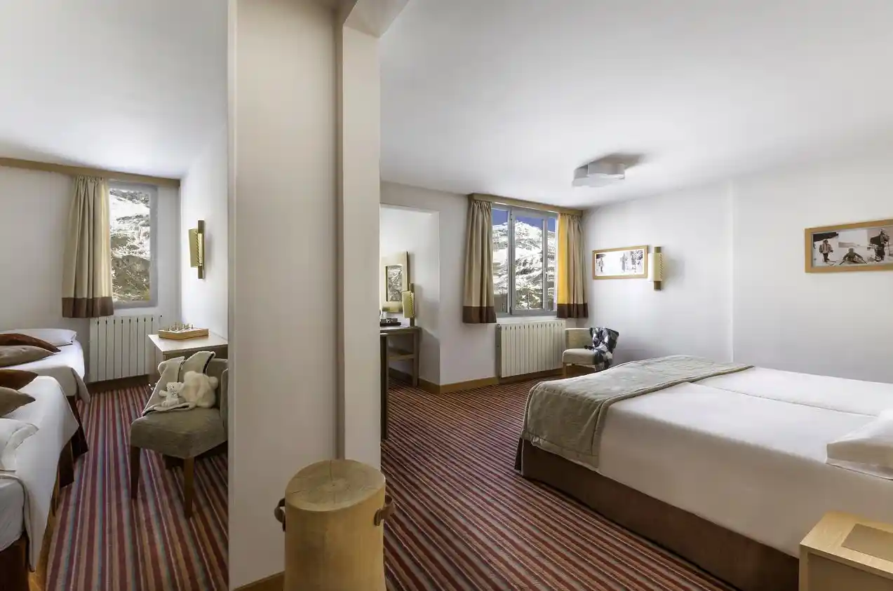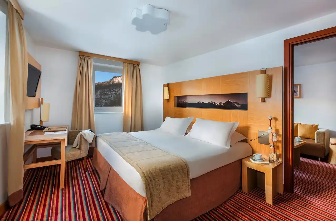Suite med soveværelse med dobbeltseng og møbleret opholdsstue. Nogle suiter har en storslået udsigt over Matterhorn
