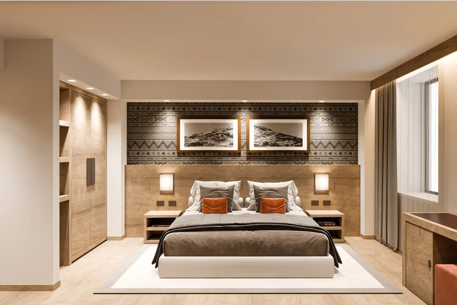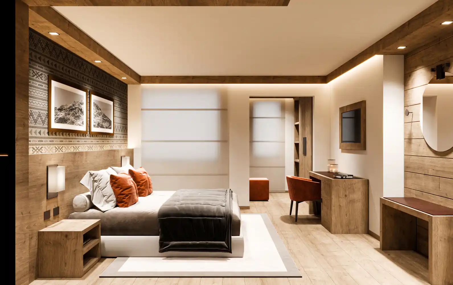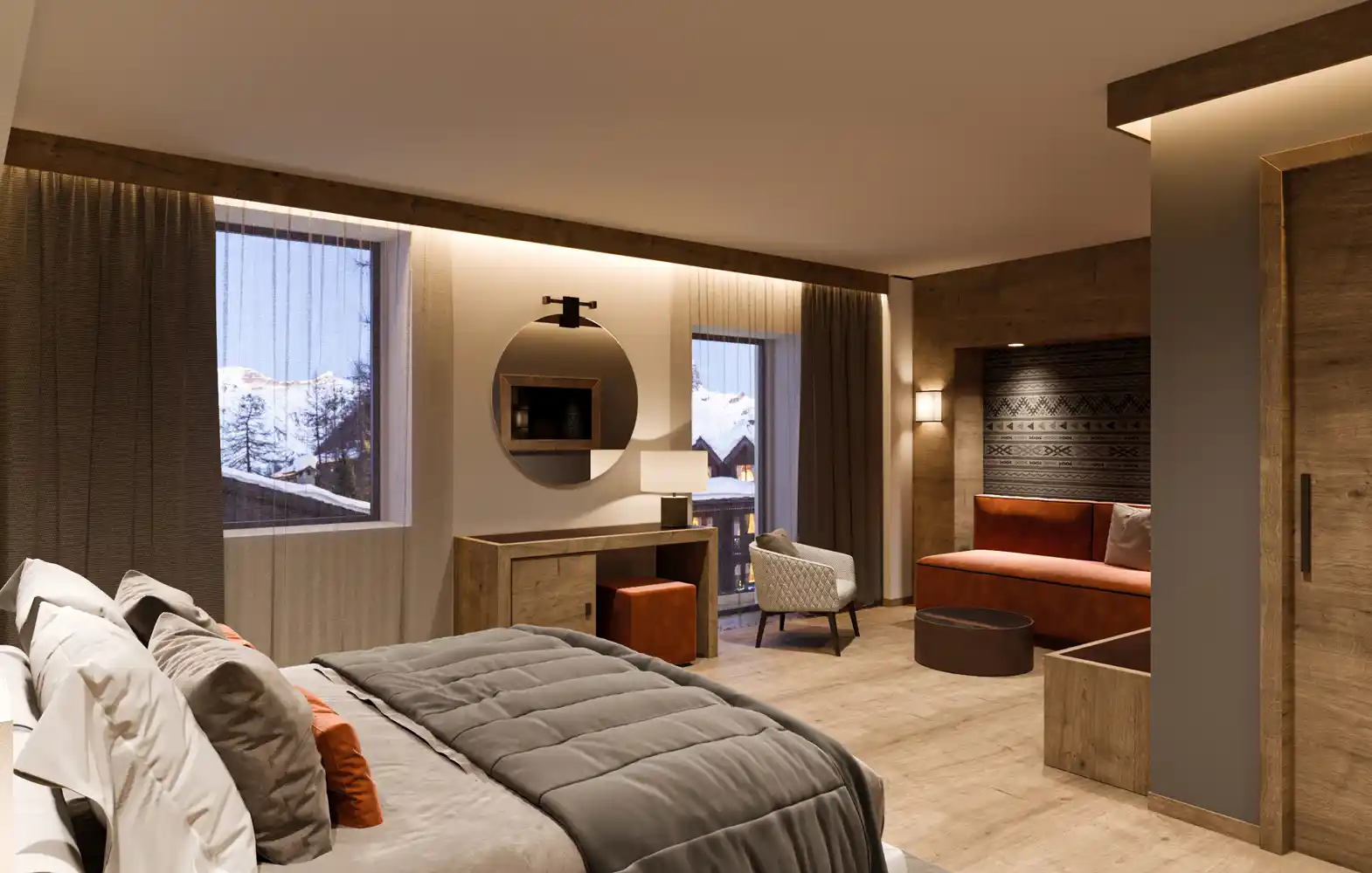 Suite med soveværelse med dobbeltseng og møbleret opholdsstue. Nogle suiter har en storslået udsigt over Matterhorn