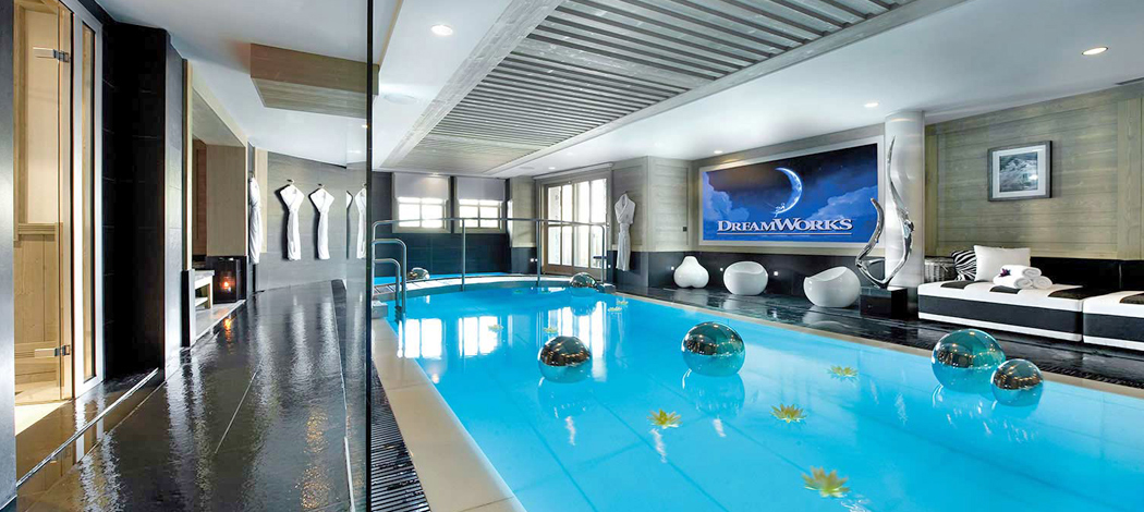 Ca. 500 kvm. fordelt pÃ¥ fire etager. Chalet med plads til 10 personer fordelt i fem soveværelser med eget badeværelse. Privat indendørs pool med jet-stream, vandfald og tyrkisk bad. Egen skikælder. Eget personale (butler, kok, tjener og rengøringspersonale). Velkomstdrink, champagne reception ved ankomsten, kolde og varmedrikke er tilgængelige under hele opholdet.  Â