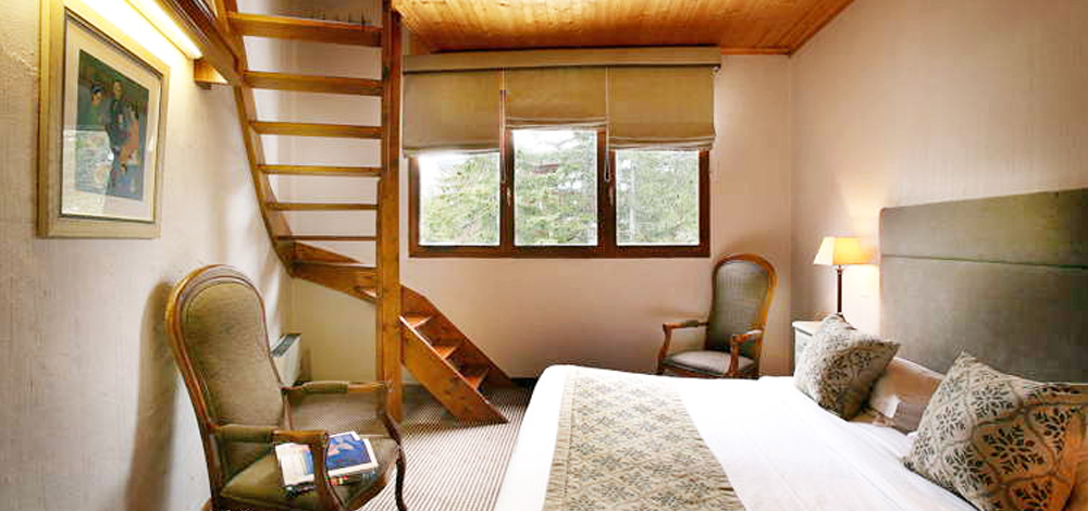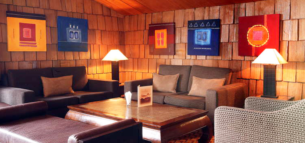 Hotellets indretning er en kombination af komfort og moderne bjælkehytte, hvilket skaber en hyggelig og varm atmosfære.