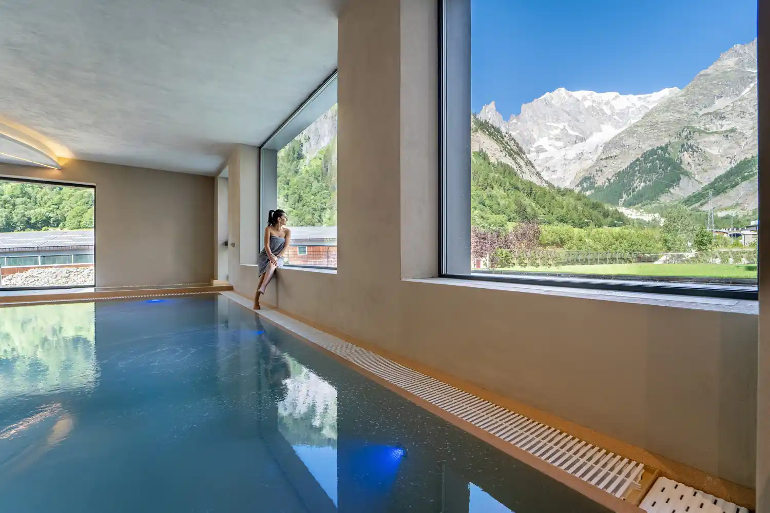 Slap af i den opvarmede udendørs pool med direkte kig til Mont Blanc, eller nyd varmen i sauna, tyrkisk bad eller boblebadet. Behandlinger og massager kan bestilles og betales efter ydelse.