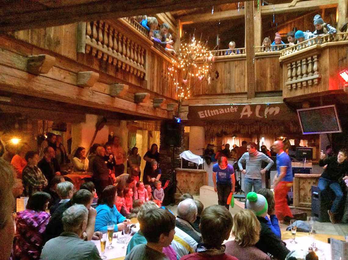 After-ski på Ellmauer Alm skal opleves - her er højt til loftet og støvledans som de kun kan det i Østrig. Med plads til ca. 250 glade skigæster der på magiske vis får serveret store lækre østrigske øl af lokale tjenere klædt i lederhosen og smukke østrigske kjoler, kan man næsten forestille sig hvordan det hele svinger efter en god dag på ski.