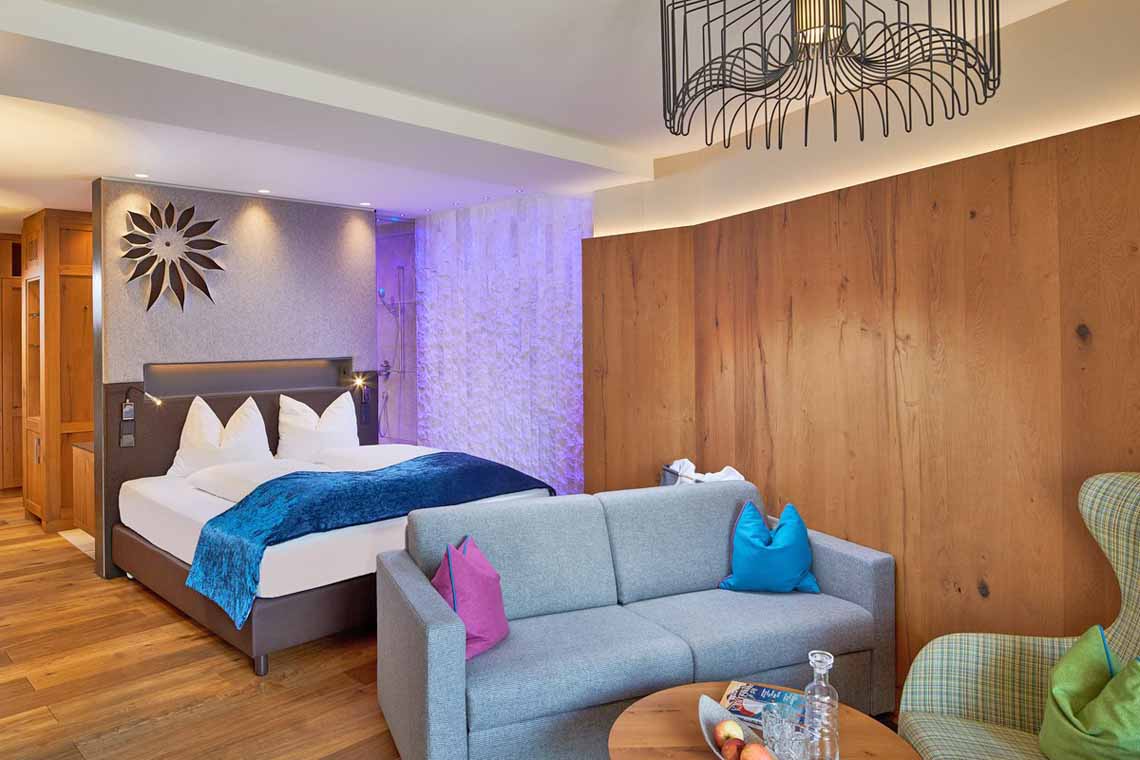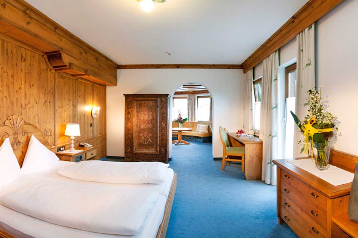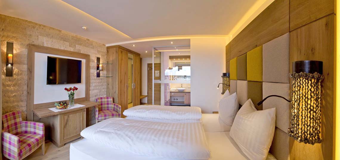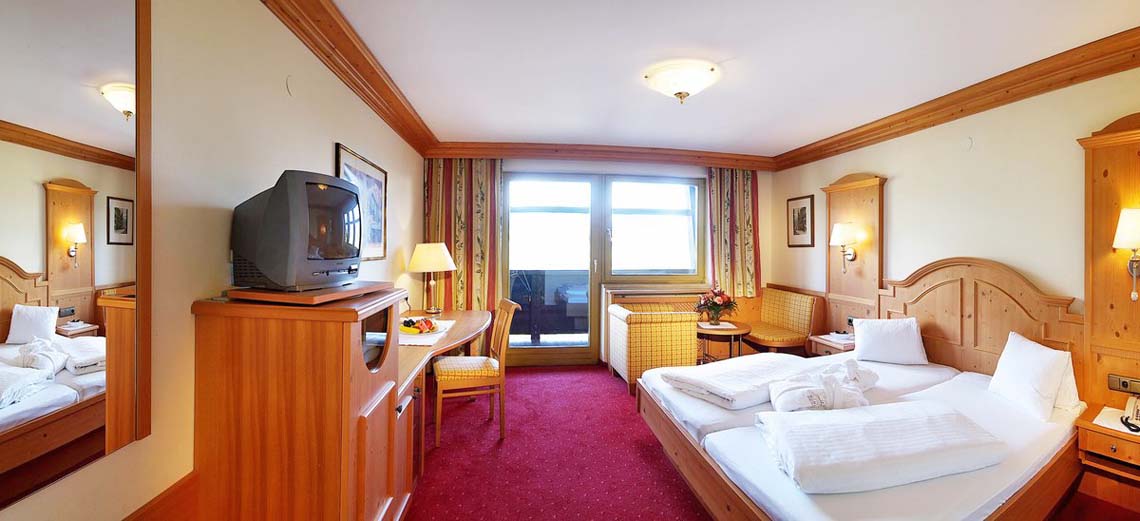 Wilder Kaiser værelse, 40 m2 hyggeligt dobbeltværelse opholdsområde, dobbelt håndvask og sydvendt balkon. Endvidere har værelset brusebad, minibar, hårtørrer, Wifi, fladskærms tv og telefon. Hund er ikke tilladt.
