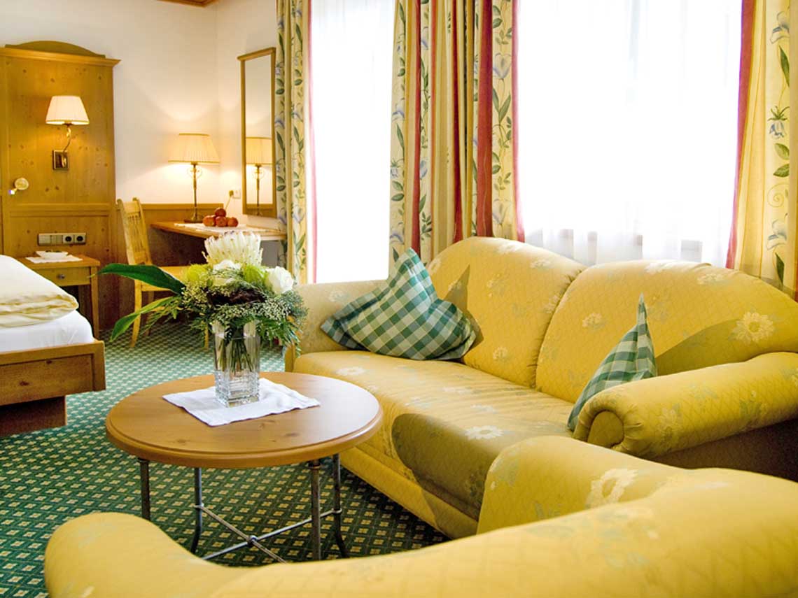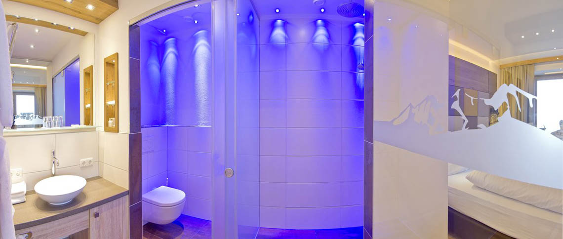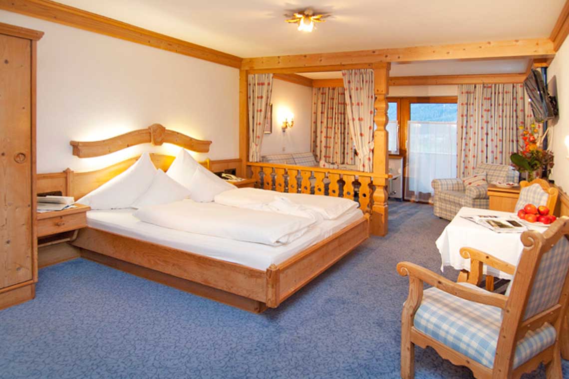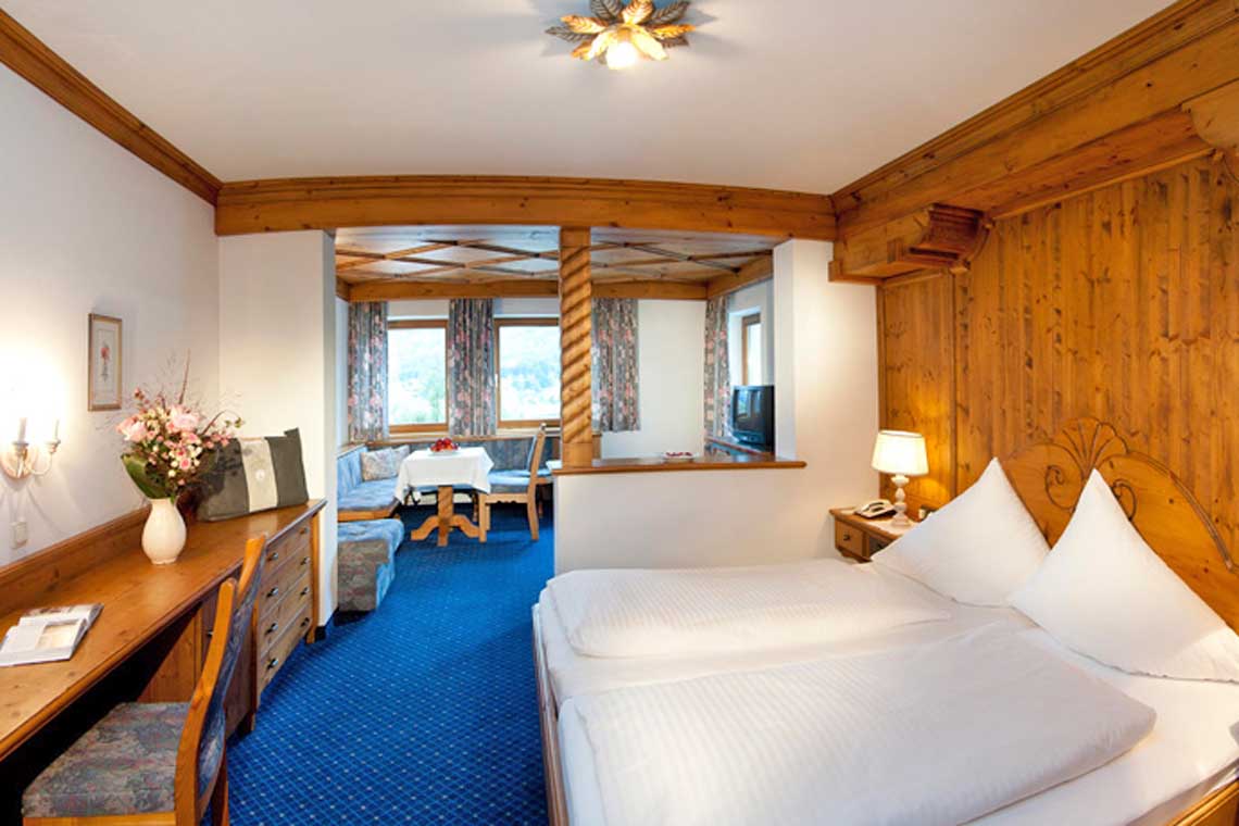 Wilder Kaiser værelse, 40 m2 hyggeligt dobbeltværelse opholdsområde, dobbelt håndvask og sydvendt balkon. Endvidere har værelset brusebad, minibar, hårtørrer, Wifi, fladskærms tv og telefon. Hund er ikke tilladt.