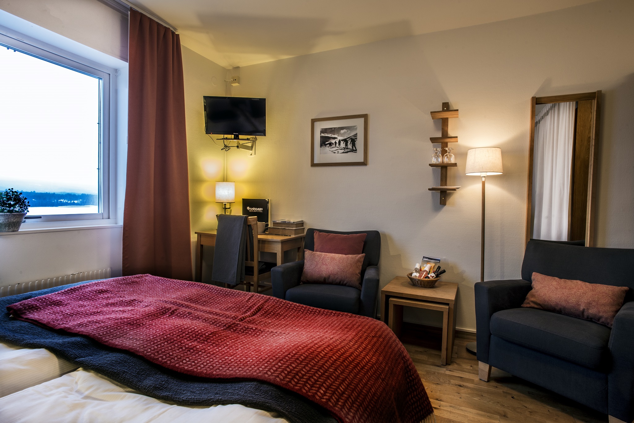 Alle Standardværelserne på Hotell Funäsdalen har plads til 4 personer og er med 1 dobbeltseng og køjesenge med plads til børnene. Ta’ derfor børnene med og opnå rigtig gode børnerabatter.