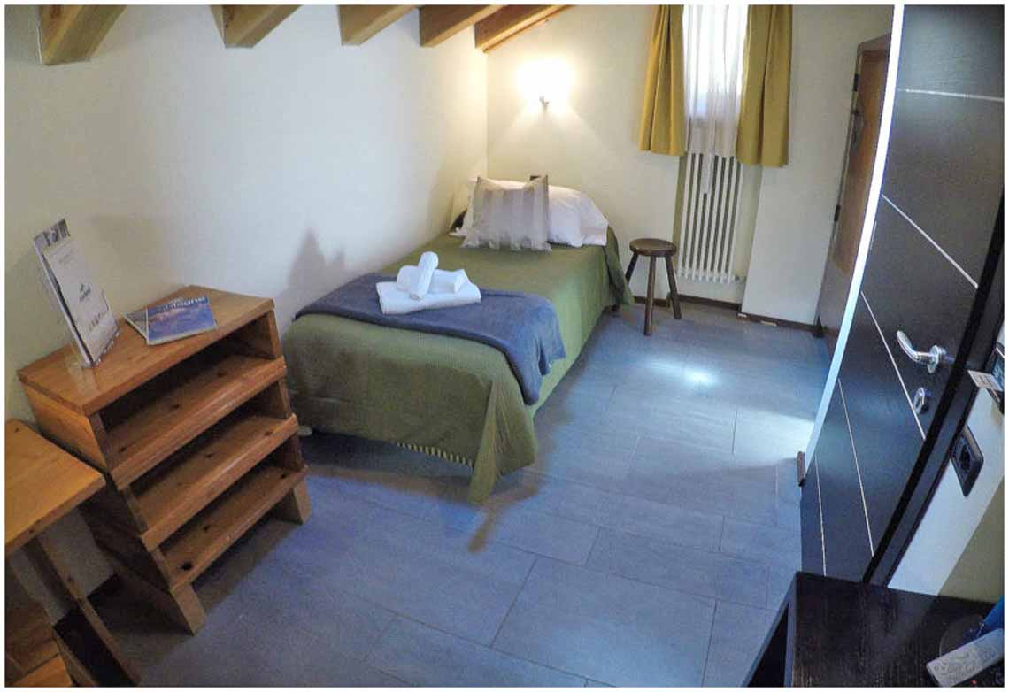 Enkeltværelserne er komfortable og har 1 enkeltseng eller 1 dobbeltseng med plads til en voksen. Værelset er placeret i 1. eller 2. etage og størrelsen er ca. 15 kvm. Badeværelse med brusebad. Nogle værelser har egen balkon, mens andre har vindue med udsigt til bjergene. På værelset er der fladskærms-TV, telefon, wifi, skrivebord, hårtørrer og vandkoger til te/kaffe.
