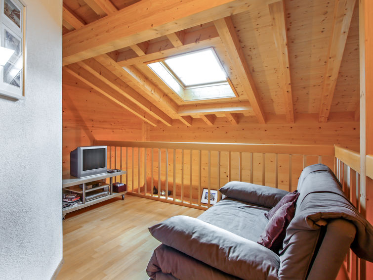 I Stueetagen er der stue/spisestue med brændeovn og fladskærms TV- fra stuen er der udgang til en sydvestvendt altan på 21 m2 med fantastisk bjergudsigt og altanmøbler. Det åbne køkken har almindelige køkkenredskaber, komfur, opvaskemaskine, kaffemaskine, raclette, fonduesæt, osv. I stueetagen er der et soveværelse med to enkeltsenge