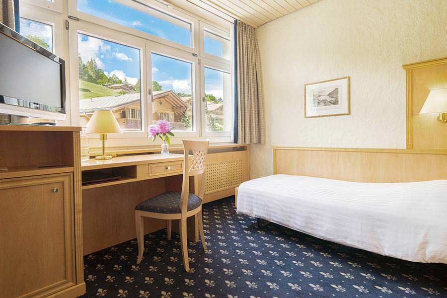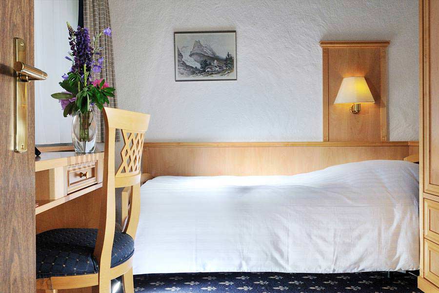 Hyggeligt værelse med eller uden udsigt til Eiger. Mulighed for opredning til 2 børn på sovesofa.