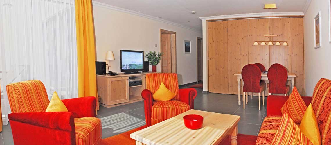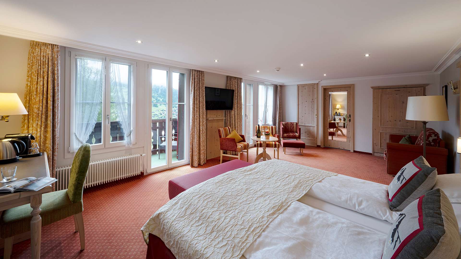 Familiesuite. Ideelt for store familier op til 6 personer. Suiten har et masterbedroom, en stue og en eller to børneværelser med to enkeltsenge. Masterbedroom har en kingsize dobbeltseng. Stuen har sydøstvendt balkon med udsigt til bjergene Eiger og Wetterhorn. Suiten har to badeværelser samt et separat toilet. Studen er udstyret med sofa, lænestole, TV, safe og minibar.