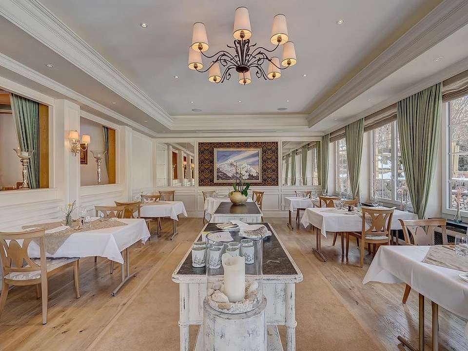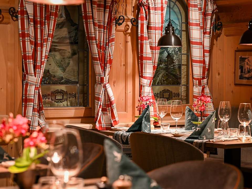 Hotellet er traditionelt og romantisk indrettet med flotte træudskæringer og sans for detaljerne. Der er morgenmad inkluderet i prisen. Den store morgenbuffet består af kolde og varme retter, og her kan du starte dagen med et glas prosecco.  Middag kan tilkøbes og nydes i hotellets restaurant, der er nomineret til Michelin. Middagen består typisk af en traditionel schweizisk 3-retters menu. Halvpension bestilles hjemmefra hos din rejsekonsulent. Det er også muligt at købe ala carte.