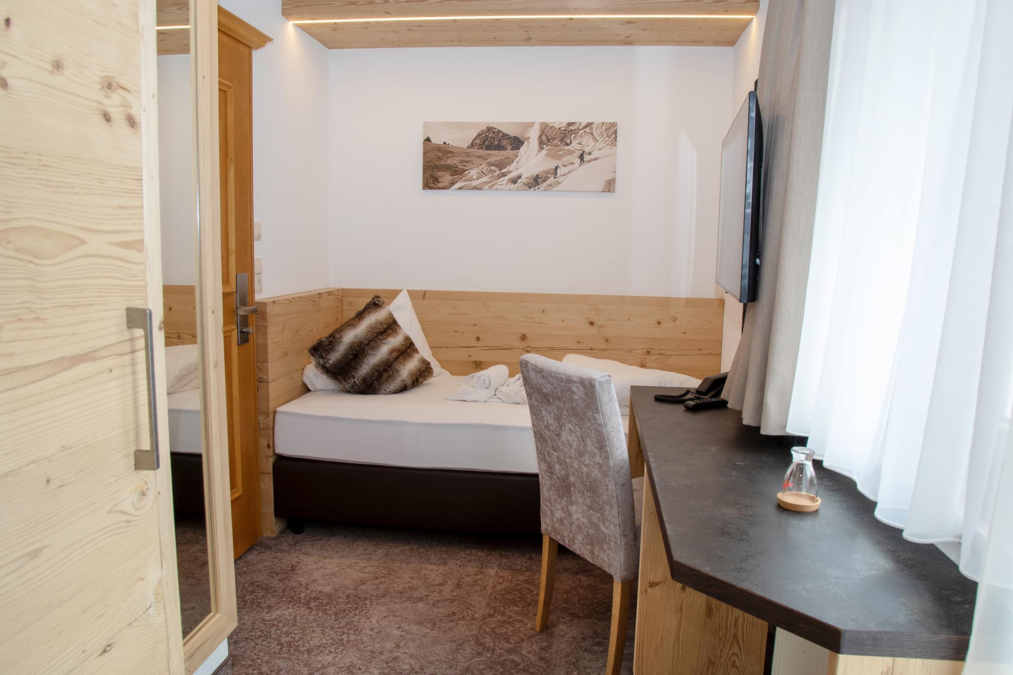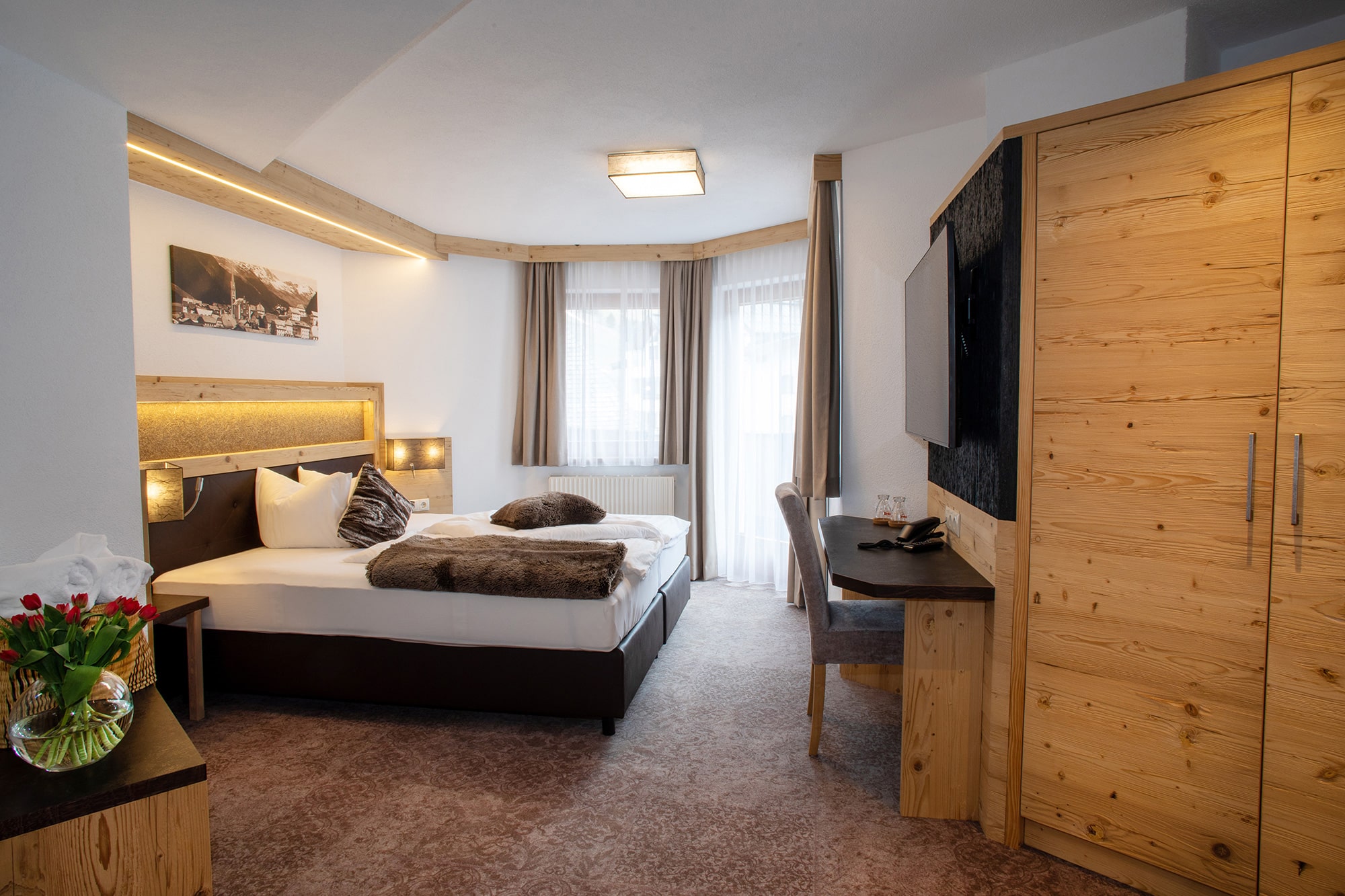 Værelset er 25 m2 med en stor dobbeltseng, nyrenoveret med moderne alpestil med massere af jordfarver og meget stemningspræget. Alle værelserne har balkon, så I kan nyde udsigten fra de omkringliggende bjerge.