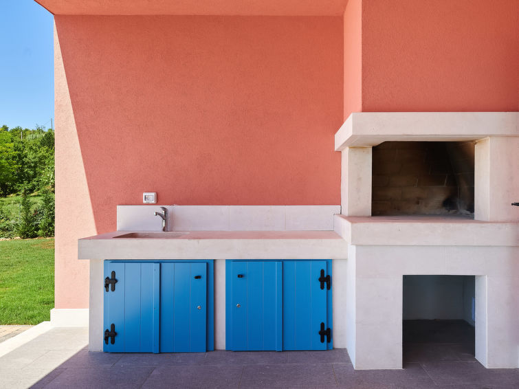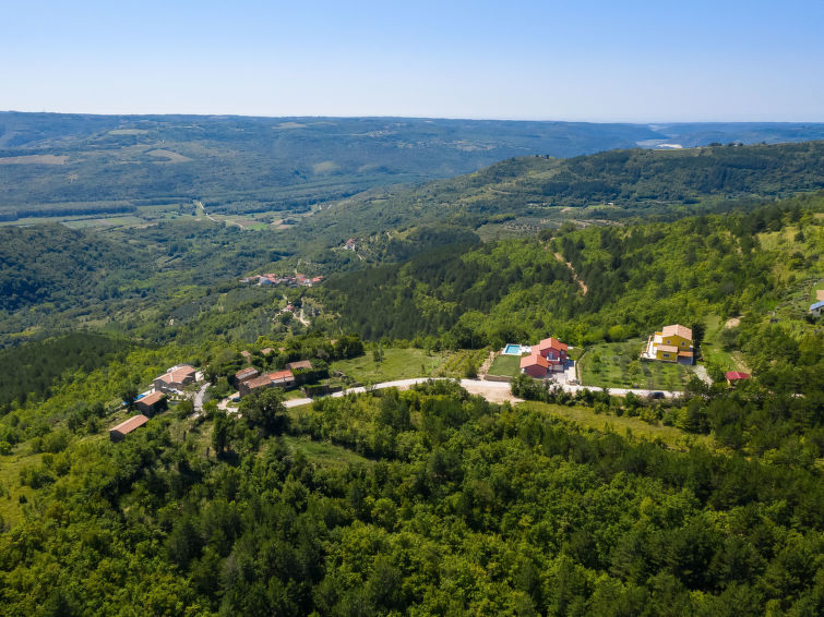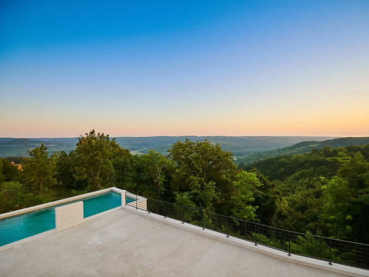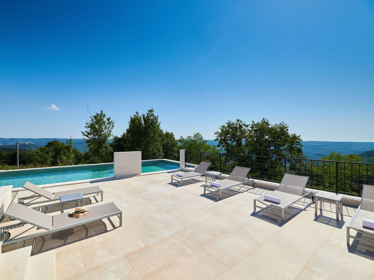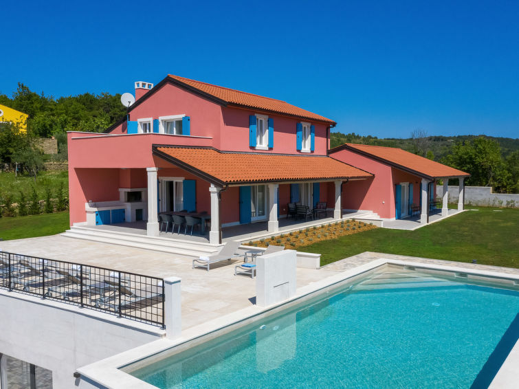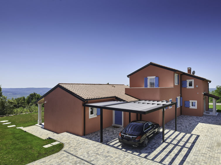 Luksuriøse ”Villa Cali" er på 2 etager og bygget i 2019. Villaen er smukt beliggende, ugenert med udsigt til vinmarker, olivenlunde og små landsbyer. Det ligger 2.5 km fra bymidten af Oprtalj, 20 km fra centrum af Buzet, 30 km fra havet. Til ejendommen hører: grund 1'500 m2, have med græsplæne og træer, pool kantet, med varme (10 x 7 m, 150 cm dyb, 01.05.-28.09.) med trappe. Udendørs brus, terrasse (37 m2), havemøbler, grill. I huset: adgang til internet, aircondition, vaskemaskine, tørretumbler. Til afbenyttelse: cykler (4). Kok muligt (ekstra). Morgenmad efter aftale (ekstra). Lufthavn transport (ekstra). Parkeringsplads (for 4 biler) ved huset på grunden.