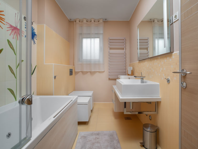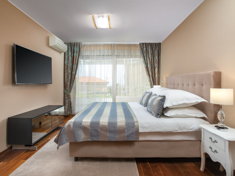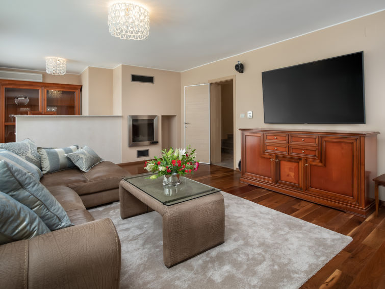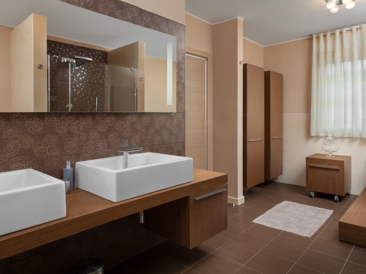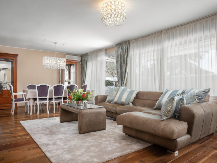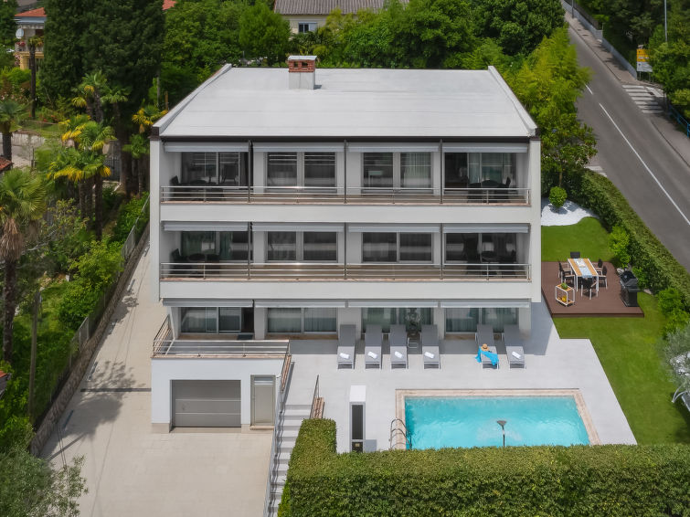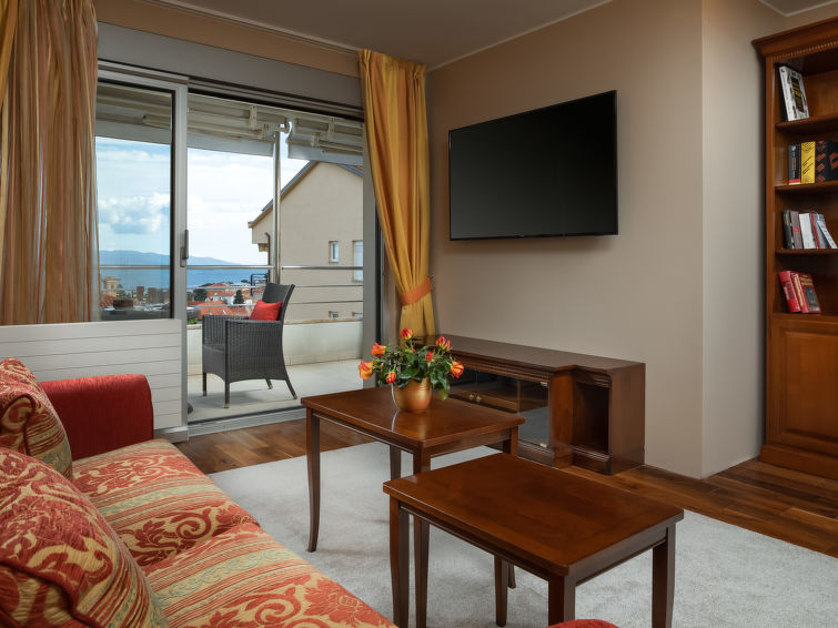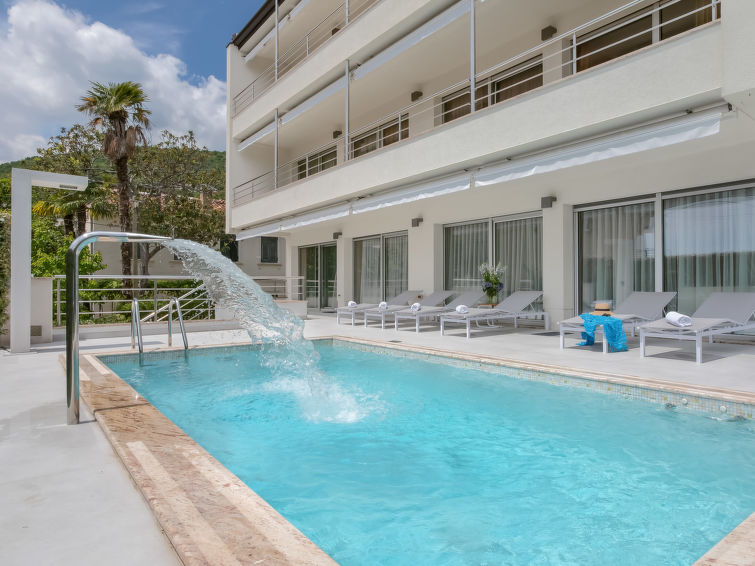 Villa "Adriatic Aquarelle", på 3 etager. 500 m fra bymidten af Opatija, solrige beliggenhed, 400 m fra havet, 400 m fra stranden. Til disposition: grund 650 m2 (indhegnet), pool kantet (6 x 3 m, 150 cm dyb, 01.05.-31.10.). Udendørs brus. I huset: adgang til internet, infrarød sauna, alarmanlæg, vaskemaskine, tørretumbler. Parkeringsplads (for 4 biler) ved huset på grunden, single garage. Indkøbsforretning 500 m, supermarked 200 m, restaurant 500 m, kiselstenstrand, strandliggende pool 400 m. Unge grupper kun på forespørgsel. Swimmingpool med modstrøm maskine og vandmassage. Der er videoovervågning af indkørsel og parkering.