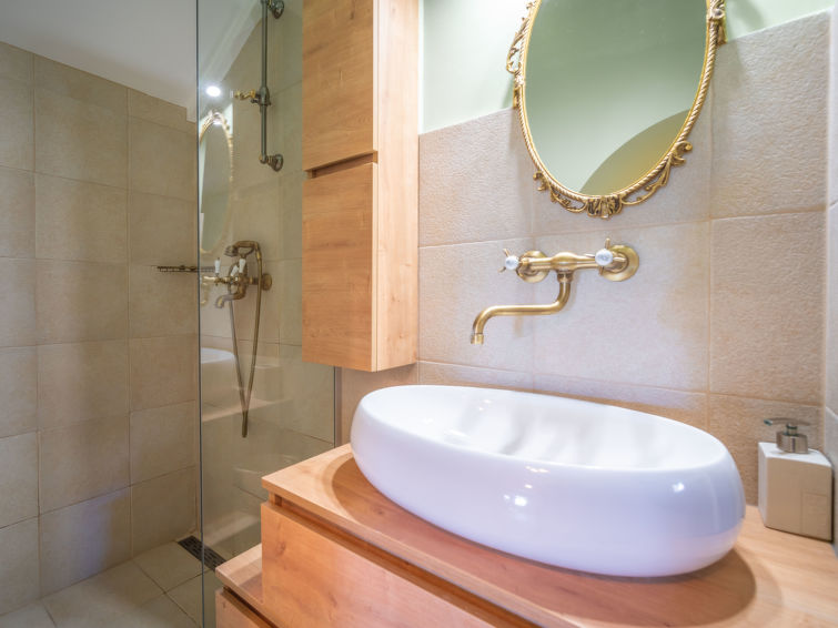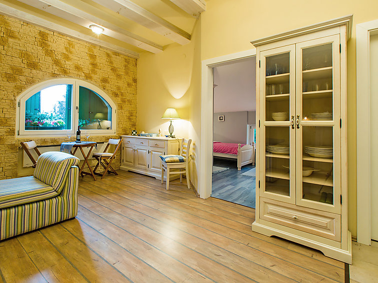 2-værelse-lejlighed 75 m2, i stueetagen. Stue/spisestue 40 m2 med sat-TV (fladskærms TV), DVD, kakkelovn og klimaanlæg. Udgang til terrasse. 1 værelse med 1 fransk seng (160 cm, længde 200 cm). Åbent køkken (4 kogeplader, ovn, opvaskemaskine, fryser, elektrisk kaffemaskine). Brus/WC. El-opvarmning. Terrasse 25 m2, overdækket. Havemøbler, grill. Til benyttelse: internet (trådløs LAN [WLAN], gratis). 1 husdyr/hund tilladt.