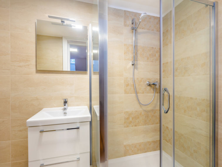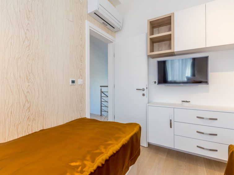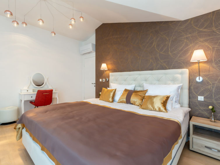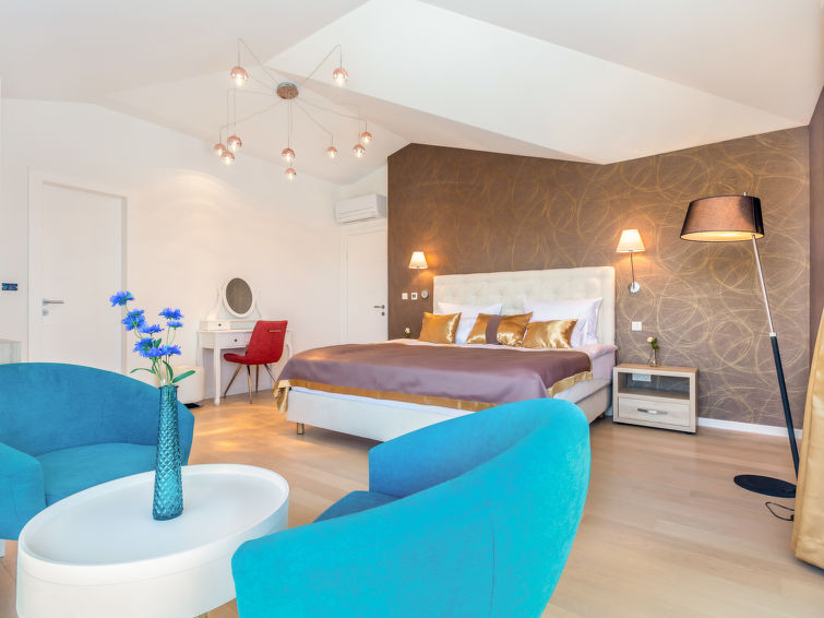 7-værelse-villa 250 m2 på 3 etager, syd vendt. Meget pæn og luksuriøs indrettet: stue/spisestue 35 m2 med 1 dobbelt sovesofa (160 cm, længde 240 cm), sat-TV (fladskærms TV), klimaanlæg. Udgang til terrasse. 1 værelse med 1 fransk seng (200 cm, længde 210 cm), brus/bidet/WC og sat-TV (fladskærms TV), klimaanlæg. Udgang til terrasse. Åbent køkken (ovn, opvaskemaskine, 4 Induktionskomfur, mikroovn, fryser, elektrisk kaffemaskine). Særskilt toilet. Nederste etage: stue med køkkenblok og sat-TV (fladskærms TV). Brus/WC. Overetage: 1 værelse med 1 fransk seng (200 cm, længde 210 cm), sat-TV (fladskærms TV), klimaanlæg. Udgang til altan. 1 værelse med 2 senge (90 cm, længde 200 cm), sat-TV (fladskærms TV), klimaanlæg. 1 stort værelse 30 m2 med 1 fransk seng (200 cm, længde 210 cm), brus/bidet/WC og sat-TV (fladskærms TV), klimaanlæg. Udgang til terrasse. Bad/bidet/WC. Gulvvarme. Altan 10 m2, 2 terrasser 25 m2, terrasse 22 m2, overdækket. Havemøbler, grill (bevægelig), liggestole. Vid udsigt over havet. Til benyttelse: pengeskab, hårtørrer. Internet (trådløs LAN [WLAN], gratis). Terrasse 15 m2.