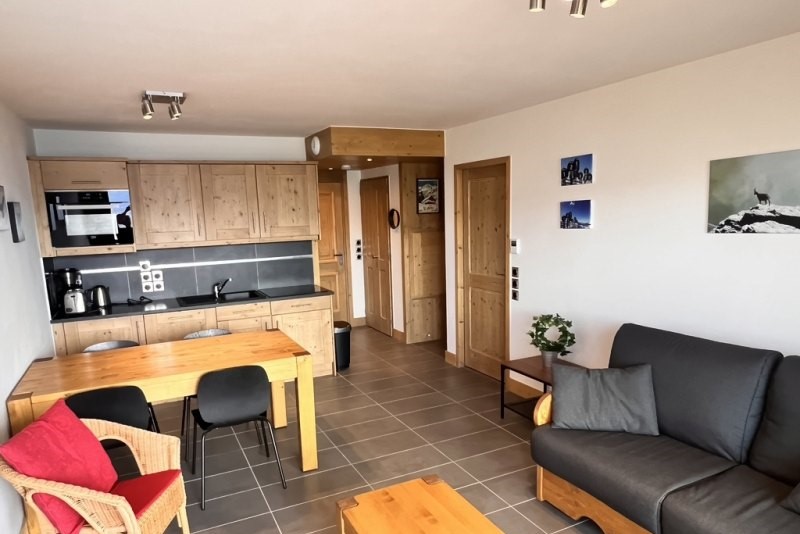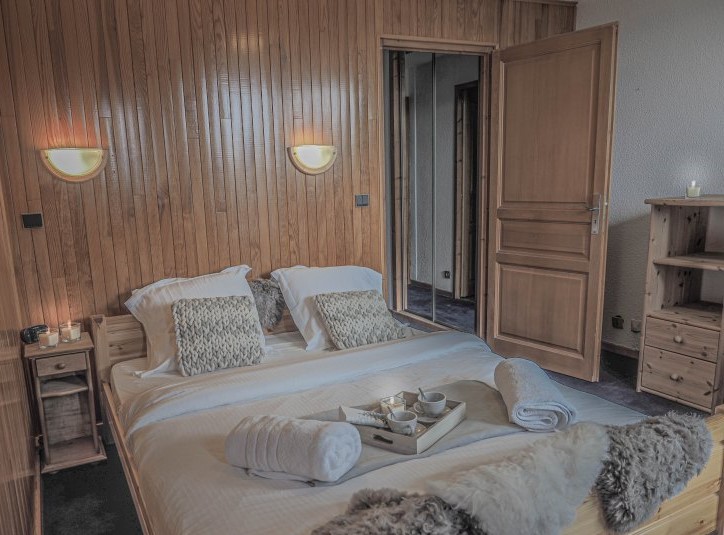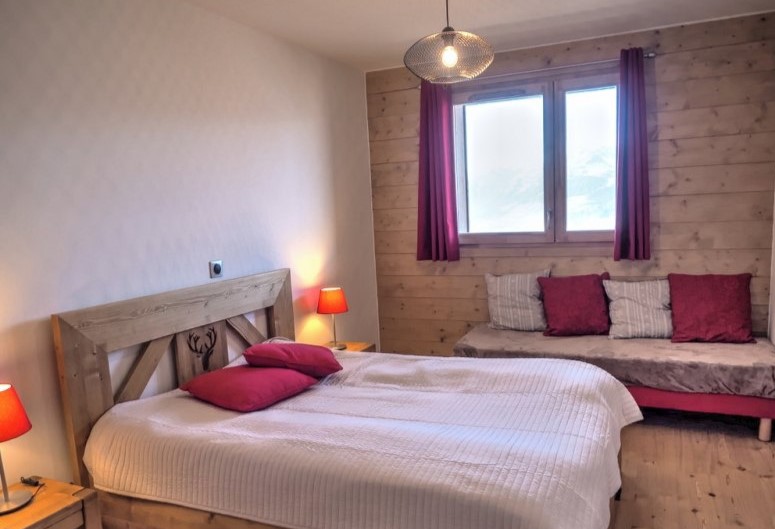 Lejligheden har direkte adgang til pisterne, derudover har 2 dobbelte soveværelser med skræddersyede træskabe og et værelse med en tredobbelt køjeseng, så i alt kan lejligheden rumme i alt 7 personer. Stuen er rummelig med store skydedøre ud til altanen med udsigt over skiområdet og La Plagne. Spisebordet har plads til 8 personer, og det moderne køkken er fuldt udstyret til selvforplejning eller catering. Der er store aflåselige skiskabe til sikker opbevaring af udstyr.