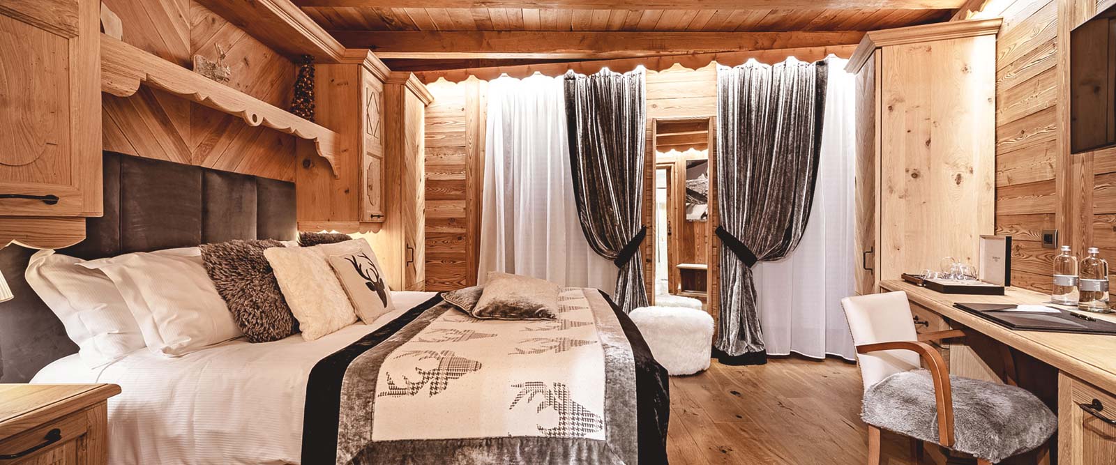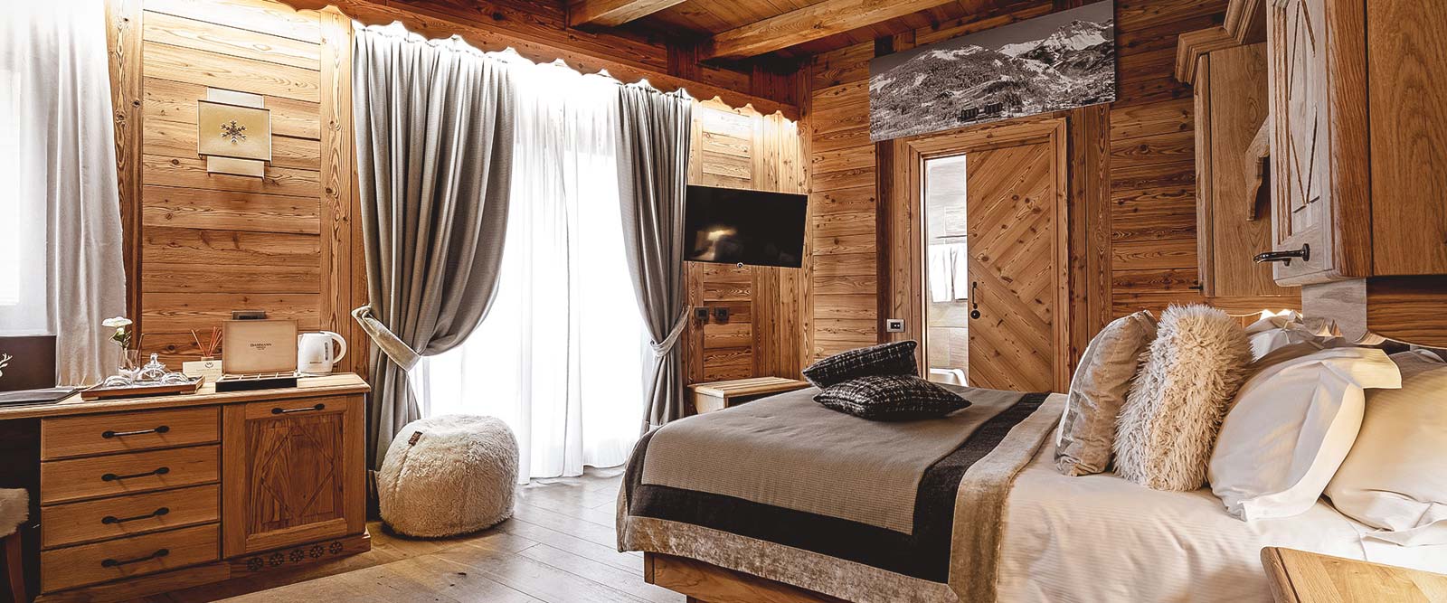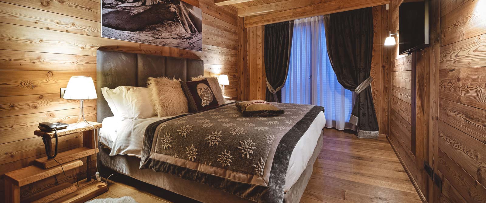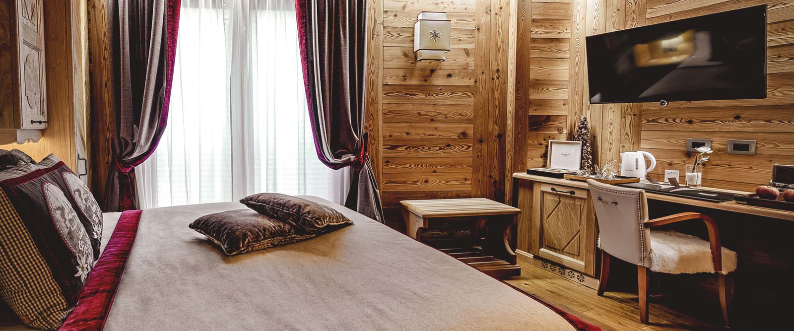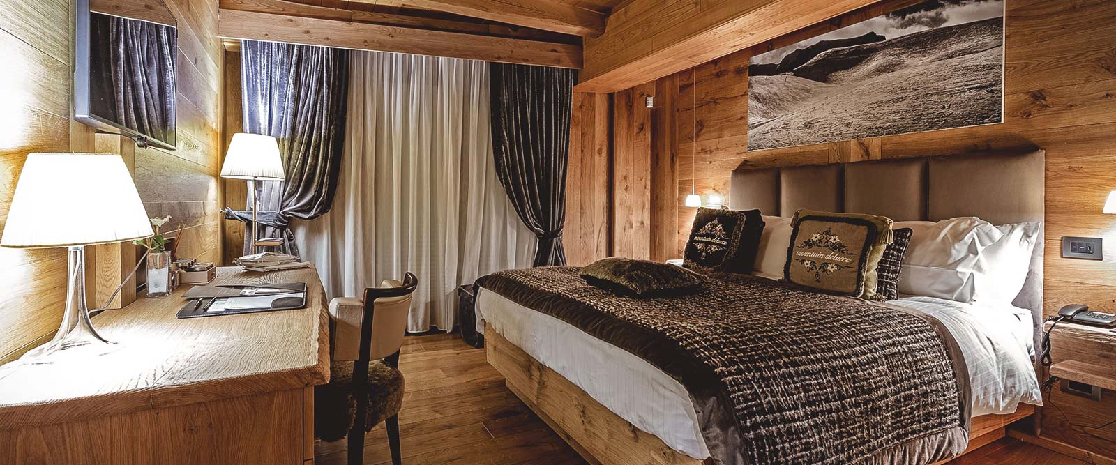 Værelserne er moderne indrettet i chalet-stil, med omgivelser i træ og sten, der giver en autentisk og luksuriøs alpestemning. Alle værelser har TV med internationale kanaler og Netflix, gratis trådløst internet, tekande og minibar, samt wellness-pakke med badekåbe, håndklæde, og luksusprodukter til badet. Nogle værelser har også kaffemaskine.