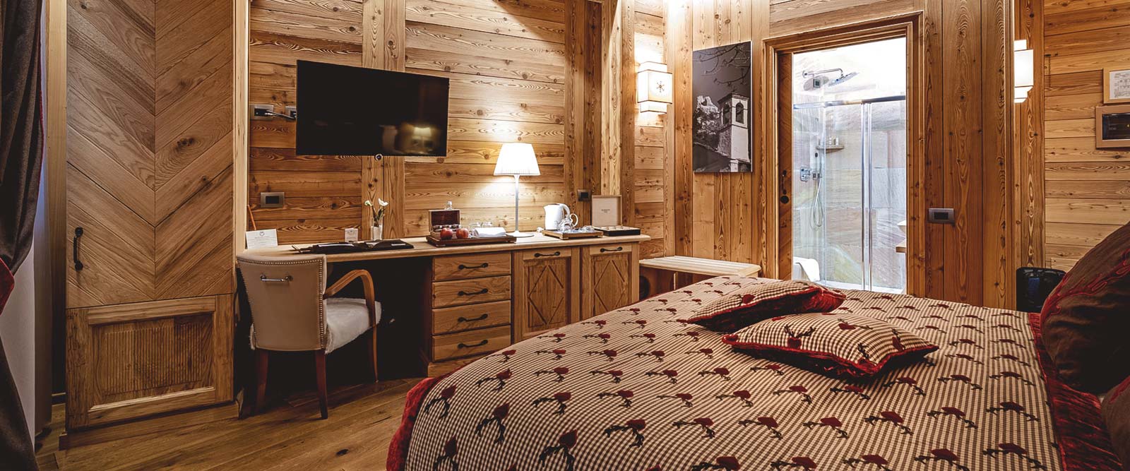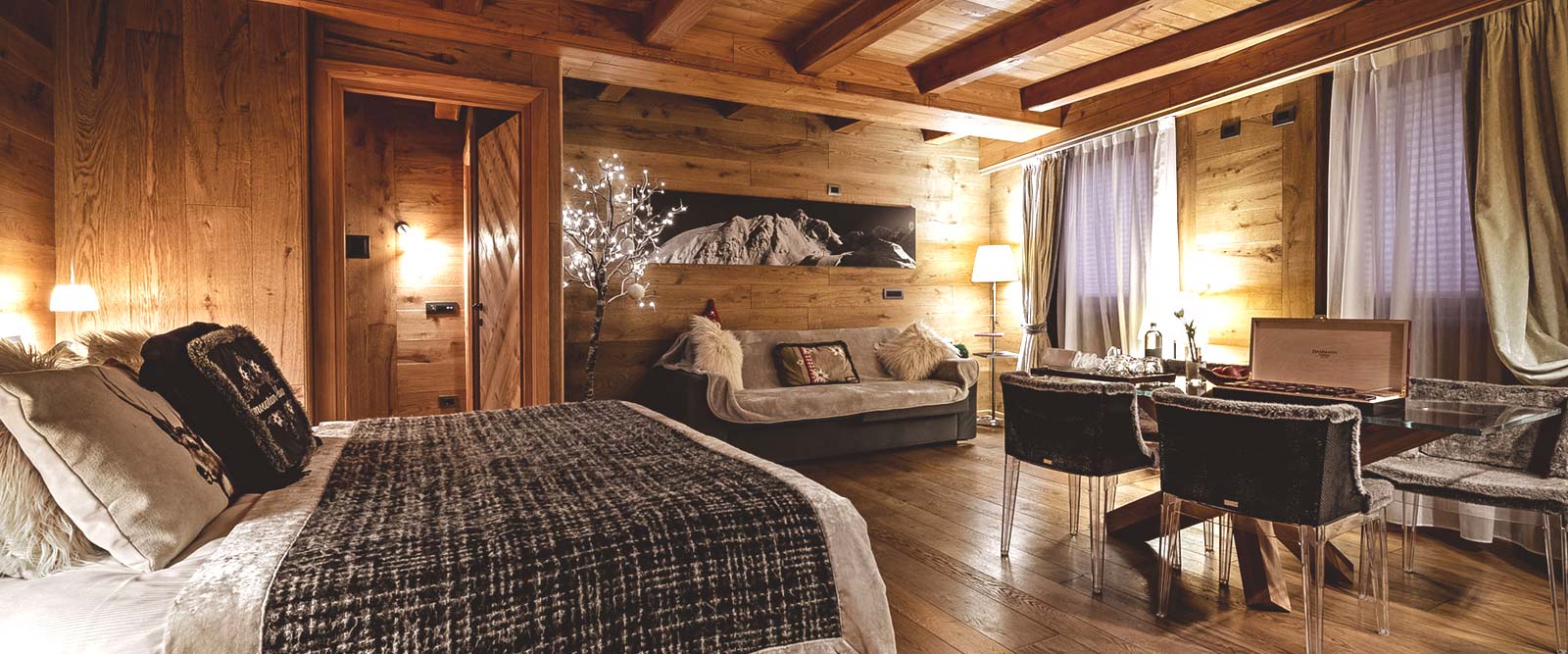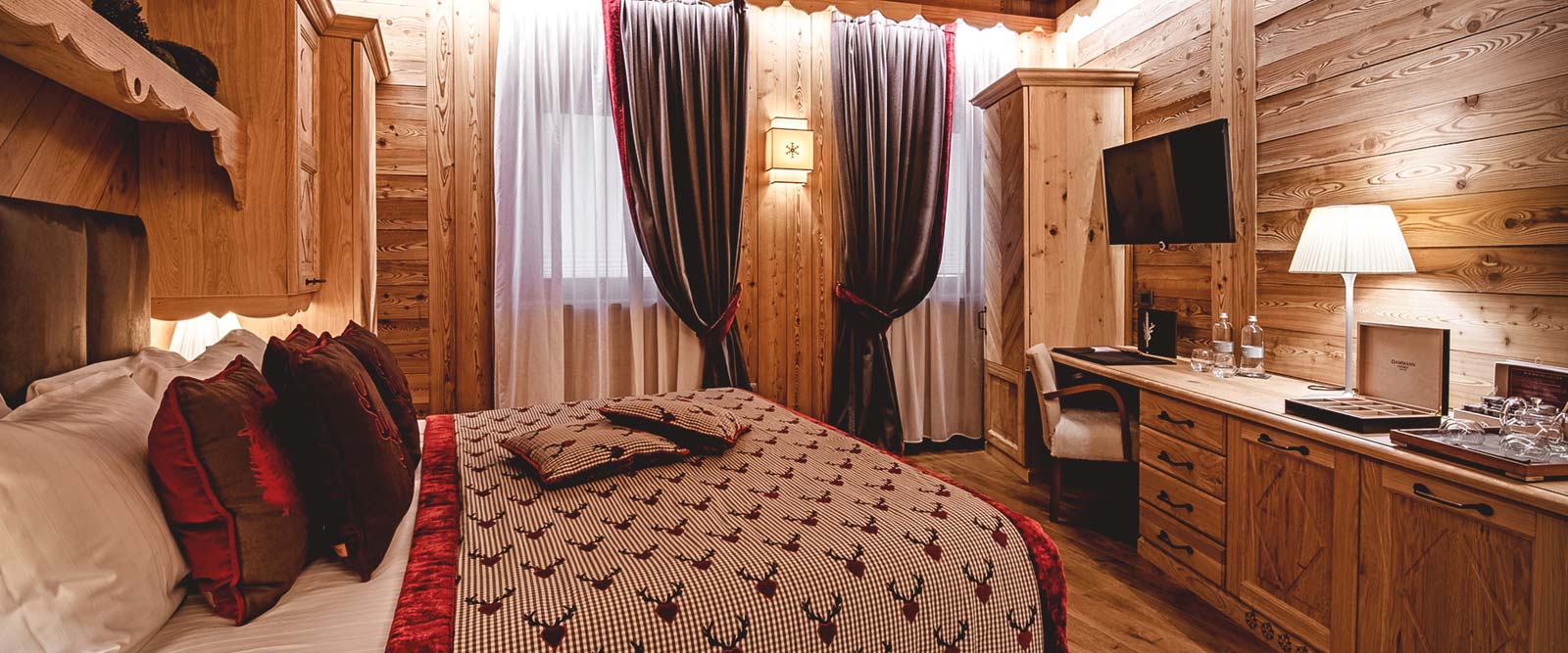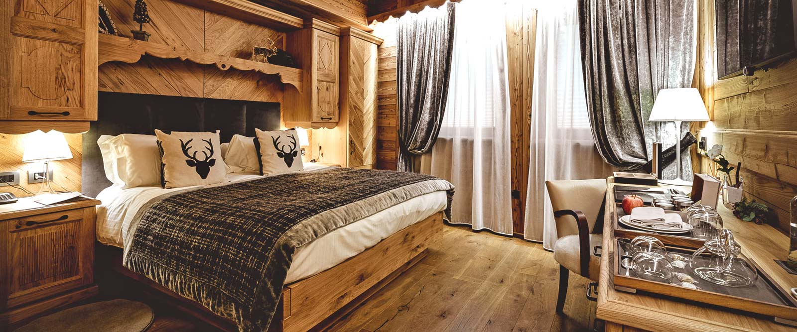 Værelserne er moderne indrettet i chalet-stil, med omgivelser i træ og sten, der giver en autentisk og luksuriøs alpestemning. Alle værelser har TV med internationale kanaler og Netflix, gratis trådløst internet, tekande og minibar, samt wellness-pakke med badekåbe, håndklæde, og luksusprodukter til badet. Nogle værelser har også kaffemaskine.
