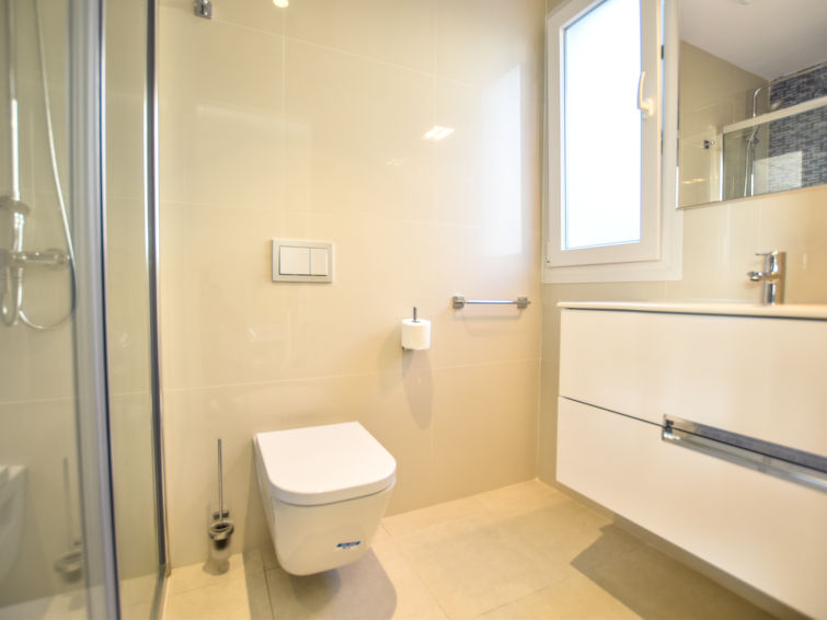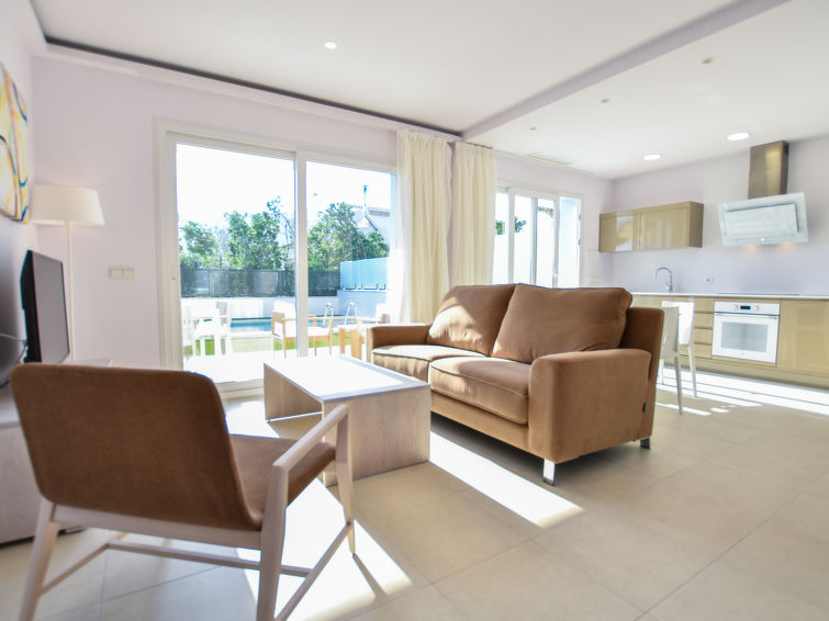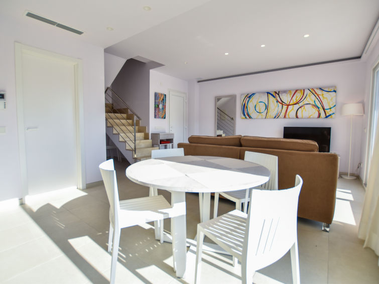 ****Villa del Lago er 110 m2 fordelt på 2 etager med 6 sengepladser, 3 soveværelser og 2 badeværelser. Villaen er stilfuldt og moderne indrettet. I underetagen er der køkken, spisestue, stue og badeværelse. Stuen har sofa, lænestol, fladskærms TV, panoramavindue og skydedør til terrassen, som har lounge- og havemøbler. Spisestuen forbinder stuen og køkkenet. Spisestuen har spiseplads til 6 personer. Det åbne køkken er velindrettet med de mest almindelige køkkenredskaber, ovn, opvaskemaskine, 3 keramiske kogeplader, mikrobølgeovn, køleskab, fryser og elektrisk kaffemaskine. Fra Køkkenet er der udgang til terrassen og poolen. Badeværelset i underetagen har toilet og bruser.