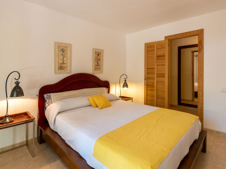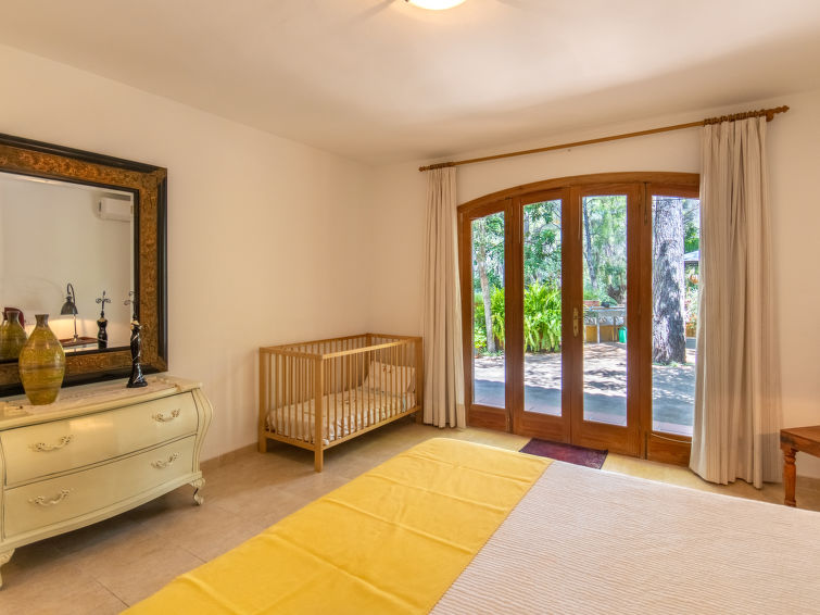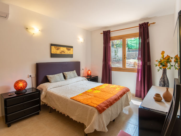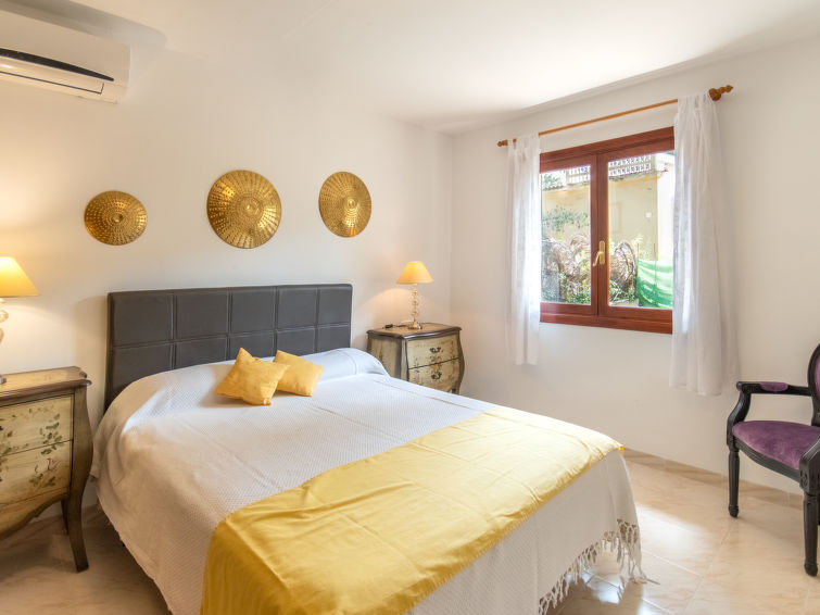 Værelse 3: Stort værelse med vindue og dør til haven og poolen. Værelset har 1 stor dobbeltseng og klimaanlæg.