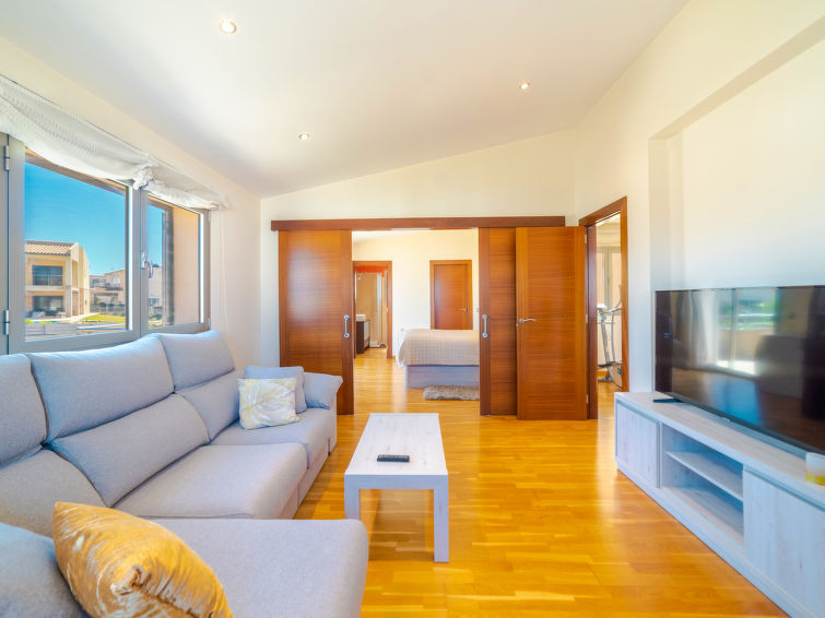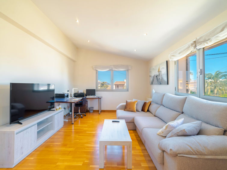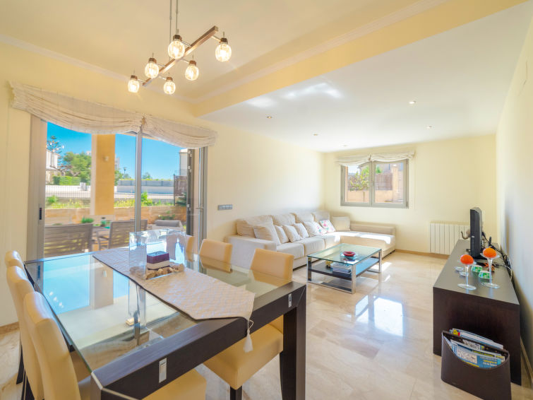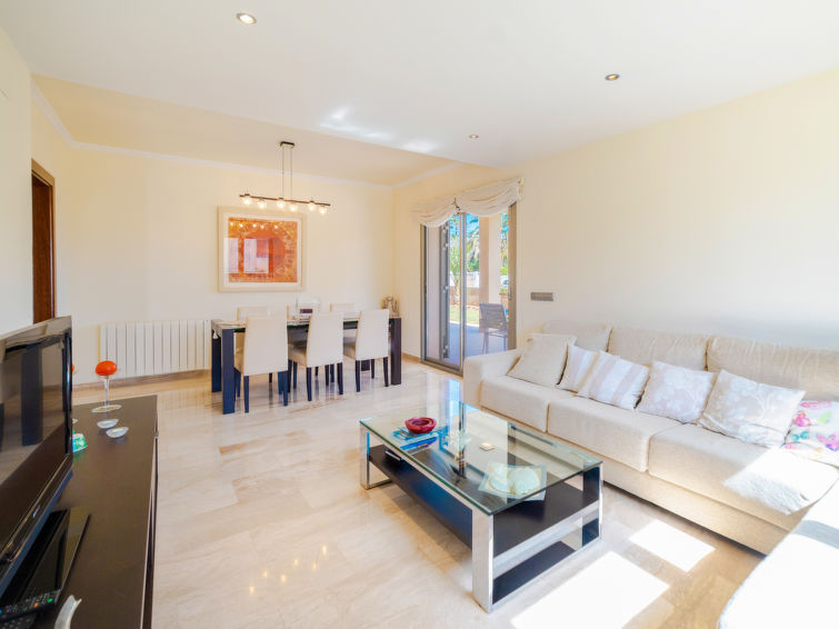 Villaen er indrettet pæn med lyse møbler der skaber en rumlig stemning. Der er en stor stue og spisestue med en stor komfortabel sofa, fladskærms TV og et spisebord. Der er et stort panorama dør med udsigt og udgang til haven lige ved poolen.