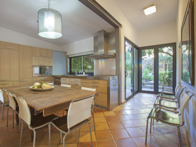 Køkkenet er stort og lyst og indeholder: ovn, opvaskemaskine, 4 induktionskomfur og mikroovn. Der er et stort spisebord og udgang direkte til haven.