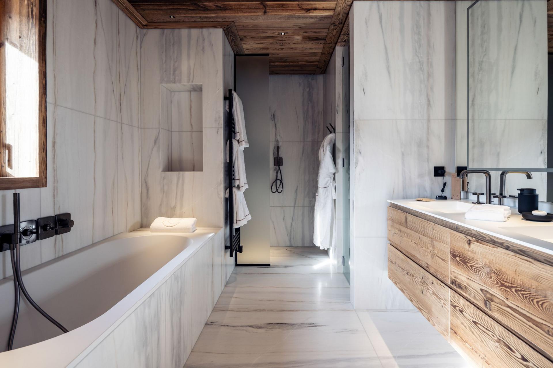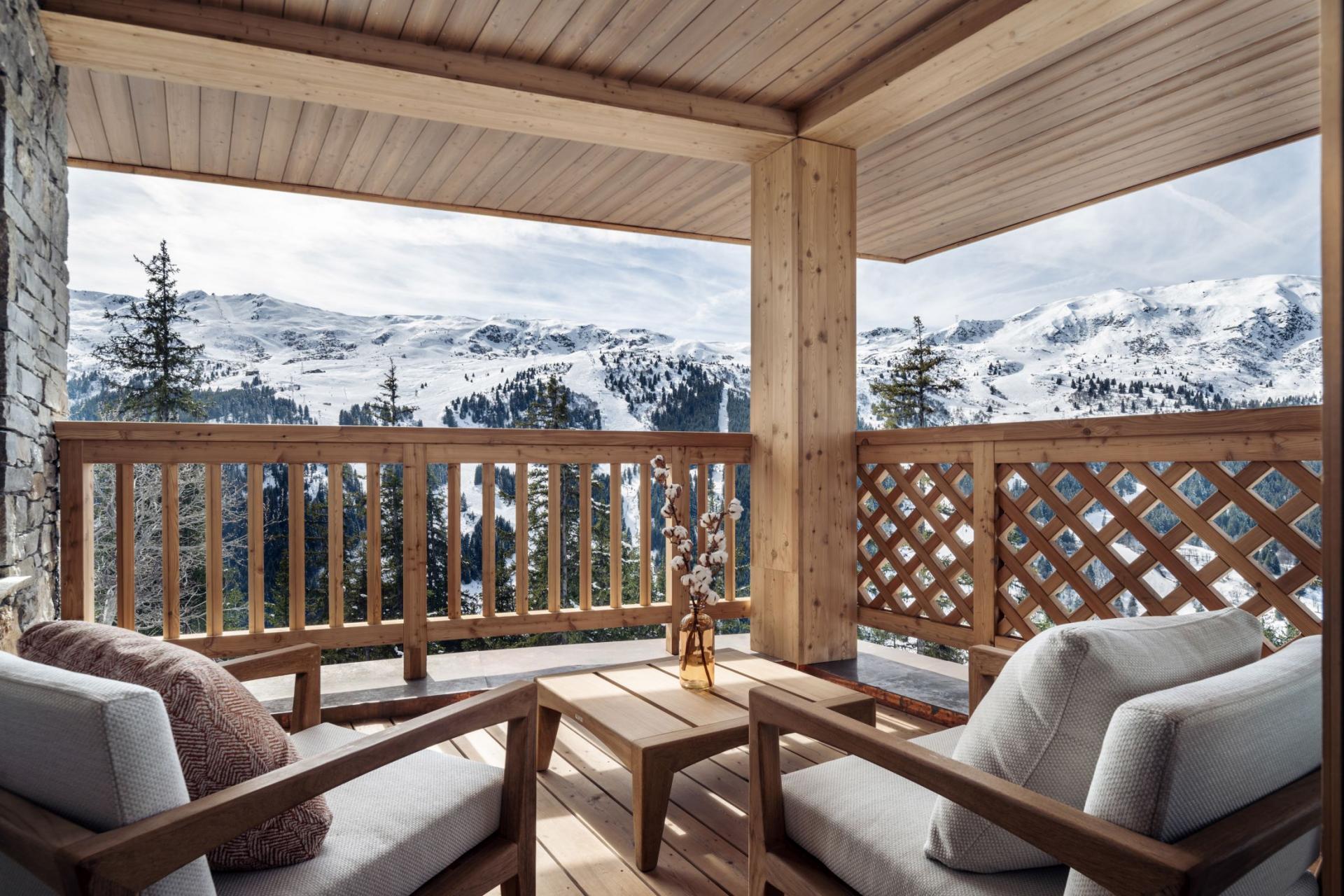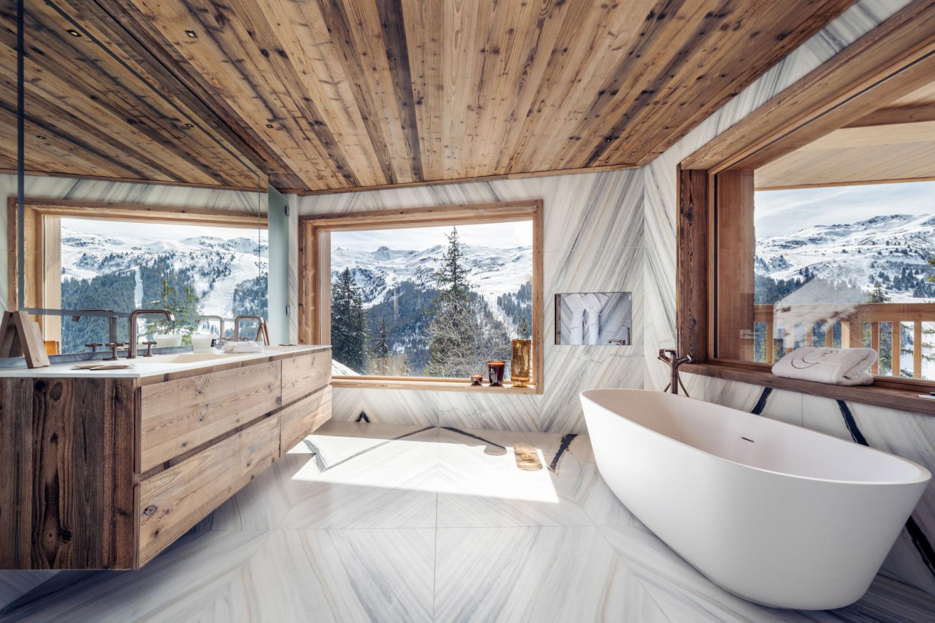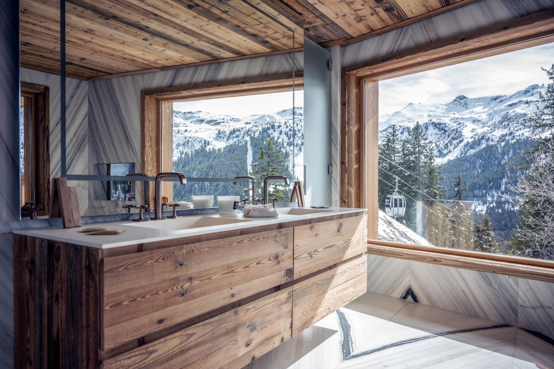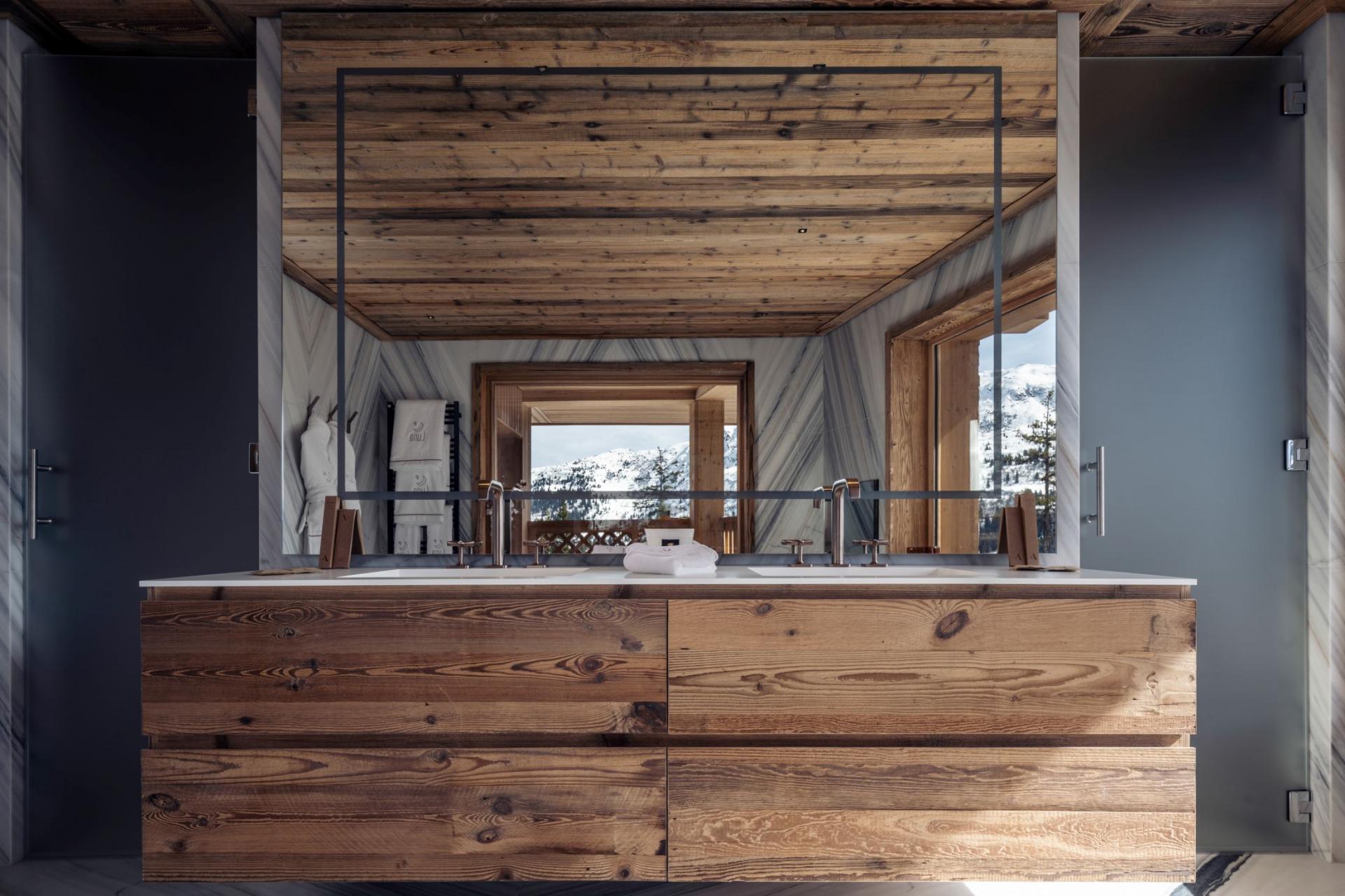 Chalet Luna is definitely a dream getaway for a luxury ski trip in Méribel. The stunning living room hosts high vaulted ceilings with floor to ceiling windows, which frame some breathtaking mountain views ahead. Modern furniture fills the room and surrounds the impressive fireplace, to ensure you remain cosy each evening. Stepping through the glass doors will lead you to the expansive balcony. Make yourself comfortable on the outdoor seating whilst gazing out across this beautiful resort. The roomy dining area features the same traditional alpine style, with enough seating for the entire group to get together during mealtimes. For a moment of quiet, Chalet Luna also features a mezzanine and reading room for guests to escape to.