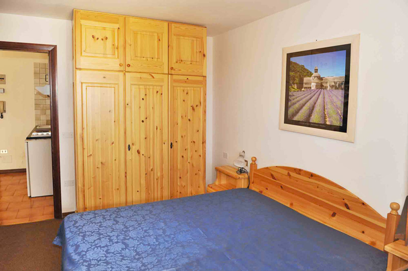 Soveværelse med 2 senge, køkken/opholdsrum med sovesofa, wc/bad, hårtørrer, telefon, sikkerhedsboks og tv.