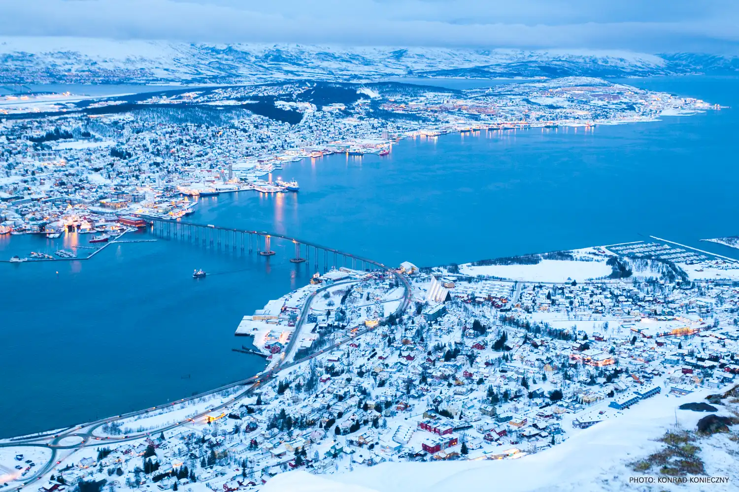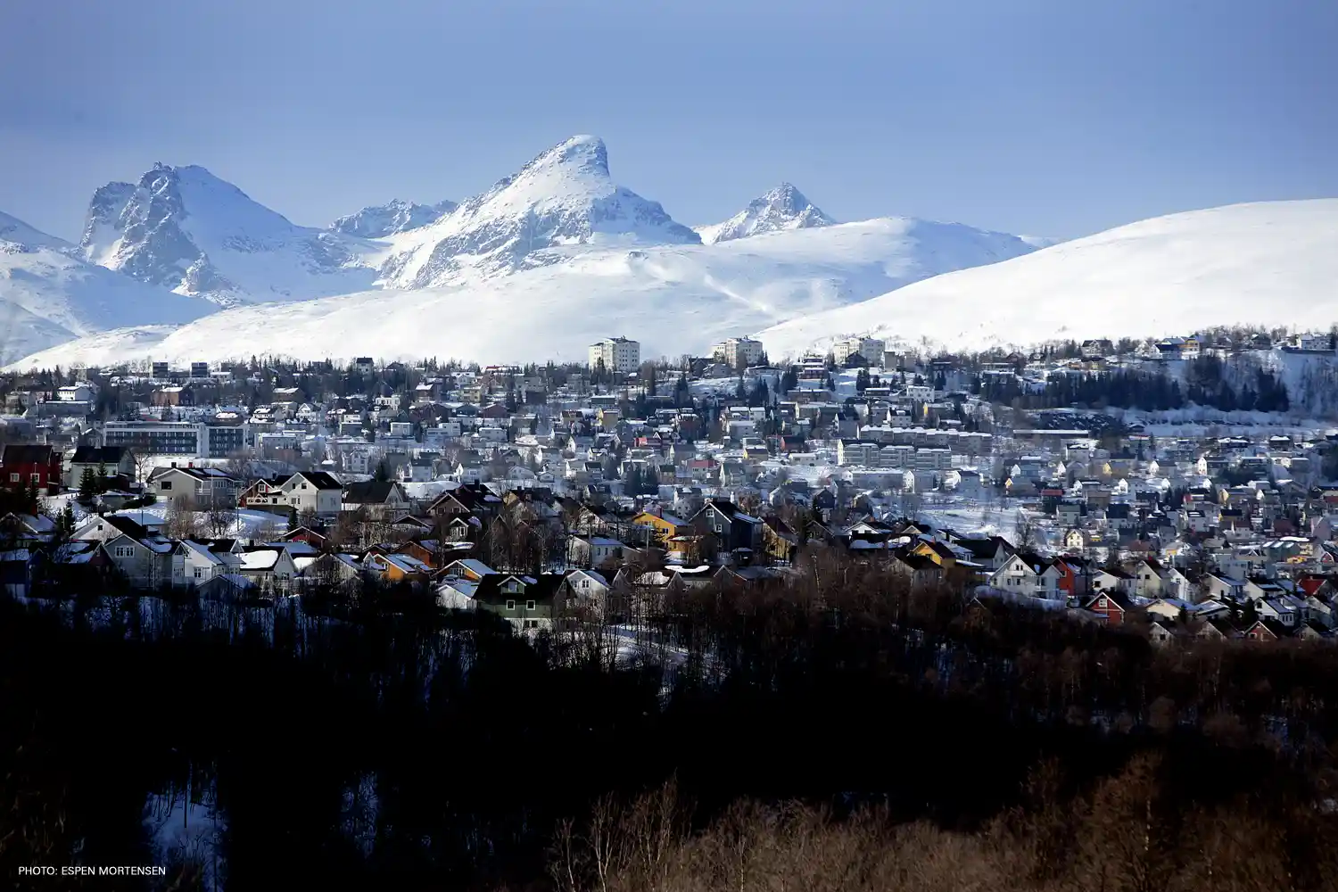Tromsø, Nordens Paris eller Den Arktiske Hovedstad, som byen også bliver kaldt, ligger 350 kilometer nord for polarcirklen. Kært barn har mange navne og det har Nordnorges største by også – det er den 12. største i Norge med 80.000 indbyggere. Tromsø er en universitetsby med et levende natteliv og en lang række gode restauranter, der får deres råvarer fra de lokale arktiske producenter. Byen er certificeret som bæredygtigt rejsemål, en blåstempling, der gives til byer, der arbejder systematisk med at reducere turismens negative påvirkninger.