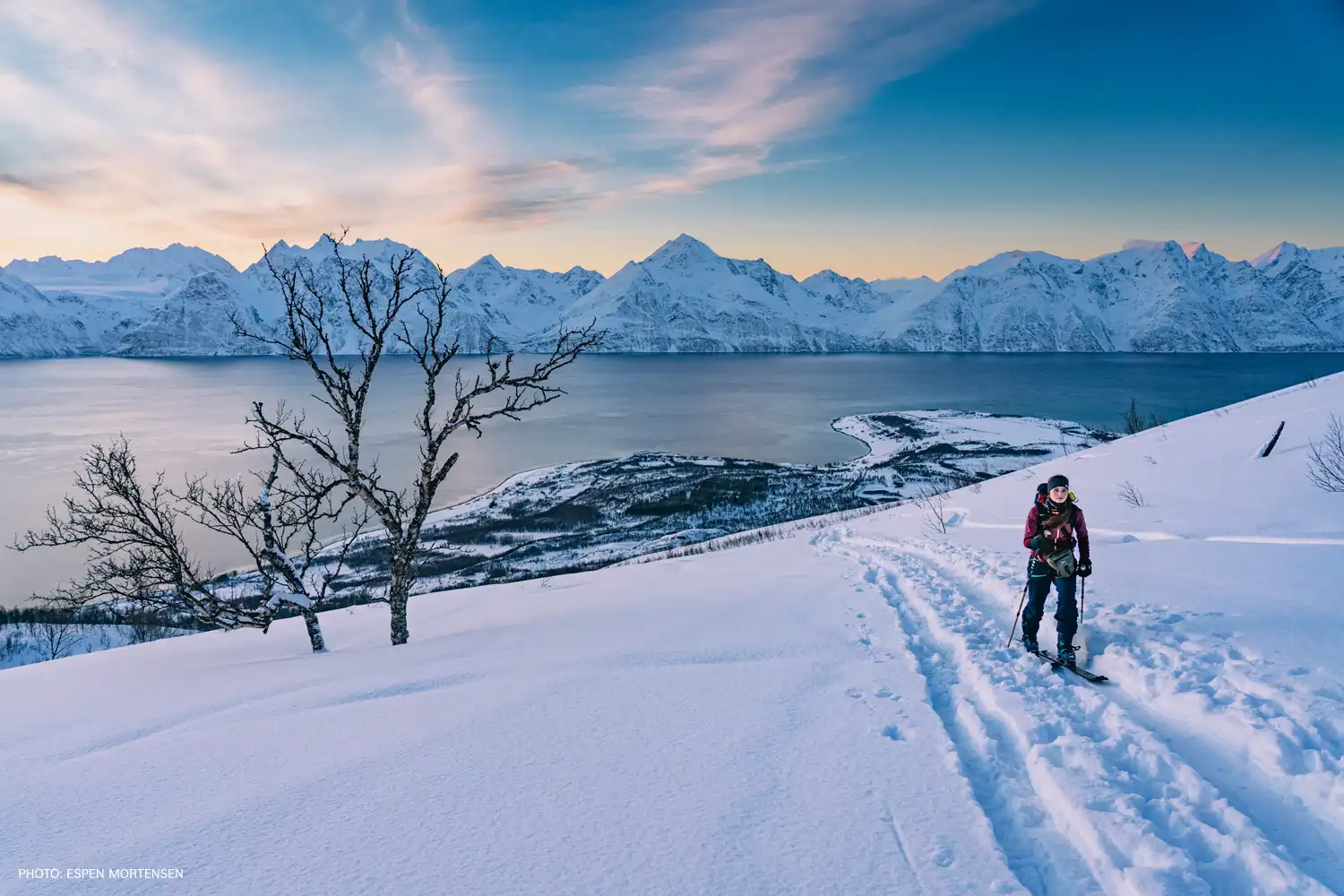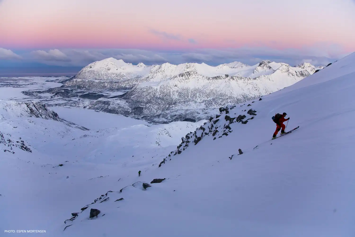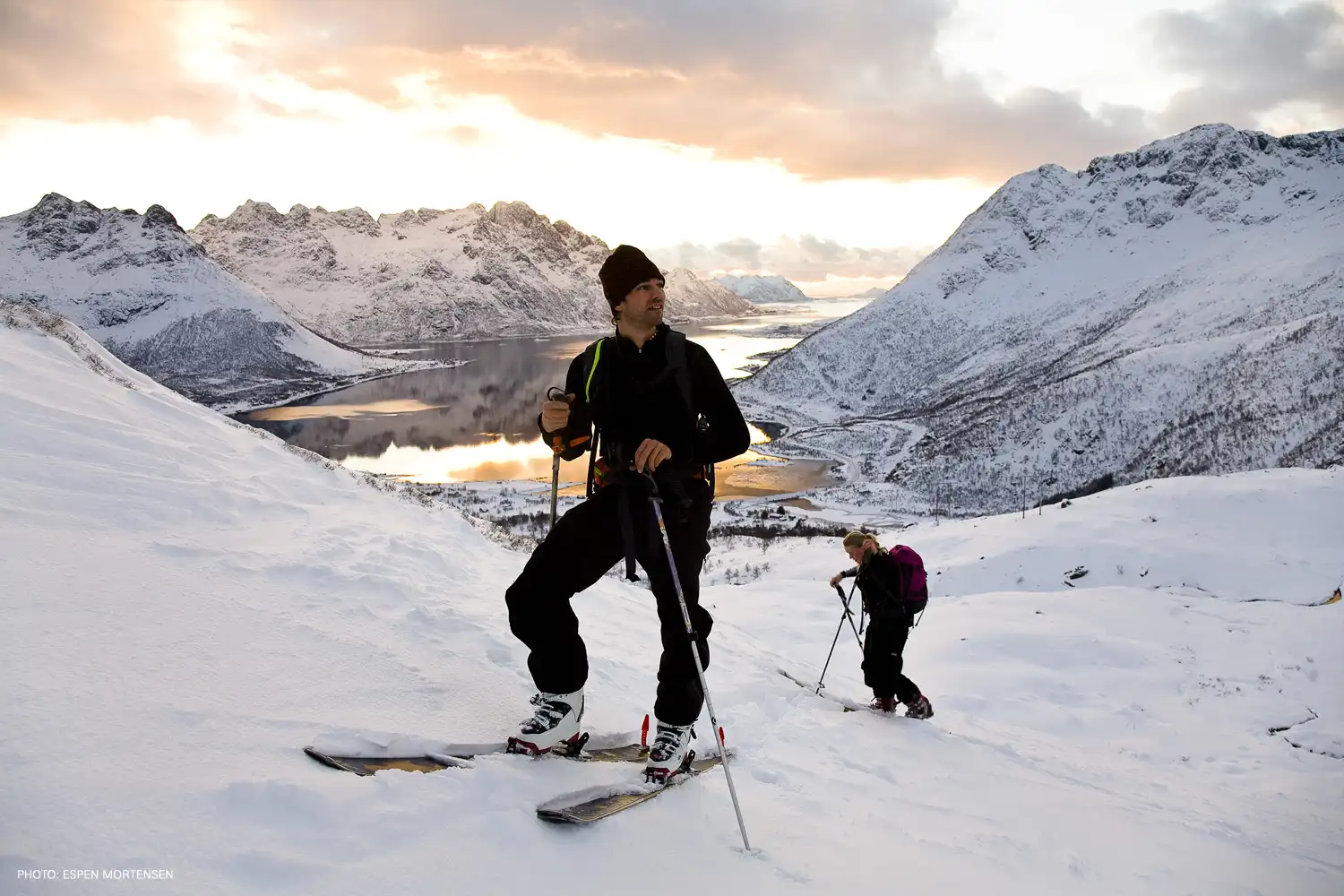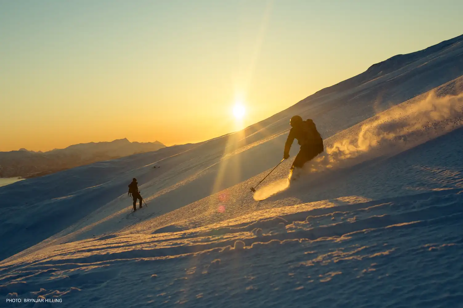Tromsø er det ideelle rejsemål til randonee og du vil stå på ski fra toppen af et fjeld direkte ned til Atlanterhavet med et fald fra 1.500 m.o.h. ned til 0 m.o.h. Du vil med stor sandsynlighed opleve det magiske nordlys og måske se hvaler i fjorden og lokale fiskere på jagt efter dagens fangst, imens du med en af vores lokale og dygtige bjergguider suser ned mod havet.