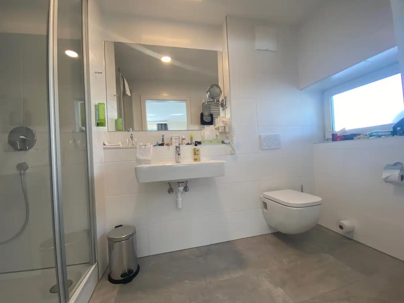 - Badeværelse med toilet, hårtørrer og brus eller badekar