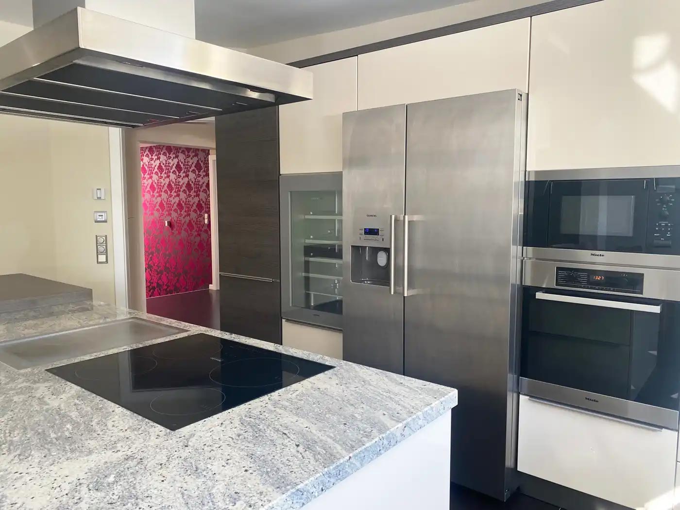 Når du aktiverer elevatoren med dit adgangskort, kommer du straks op til penthouselejlighedens entre, herfra hardu adgang til alle værelserne i lejligheden, samt naturligvis til stuen med traditionel pejs/brændeovn. Der er fire soveværelser med eget bad toilet/bad. Det store åbne køkken, opholds- og spisestue med alle moderne bekvemmeligheder, er lækkert udført og du føler dig aldrig klemt altid godt tilpas i denne utroligt gennemtænkte lejlighed, når du med et smil kigger over på vinkøleskabet, som du kan fylde efter eget valg med dejlige vine eller champagne. Køleskabet er med ismaskine, så du ikke kommer til at mangle is når du nyder en ”before dinner drink” på den vestvendte terrasse.