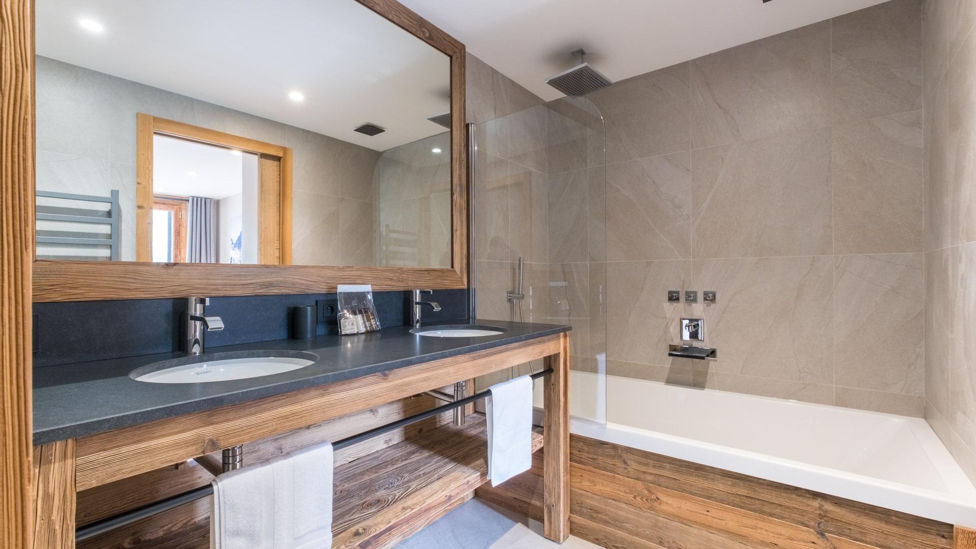 På den anden side af pejsen byder et smukt, elegant spisebord i træ din gruppe velkommen til lange måltider og hyggelige samtaler. Bag spiseområdet ligger det moderne køkken, adskilt af en forhøjet morgenmadsbar. Køkkenets design er enkelt og stilrent, men det er fuldt udstyret til at lave mad og underholde. Fra opholdsområdet fører en rummelig balkon udenfor, hvor du kan nyde bjergsolnedgange eller en aperitif i det fri.