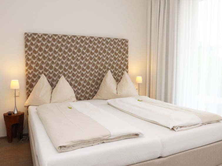 Lys og moderne chaletlejlighed med stue og 2 soveværelser med dobbeltsenge samt 1 sovesofa.