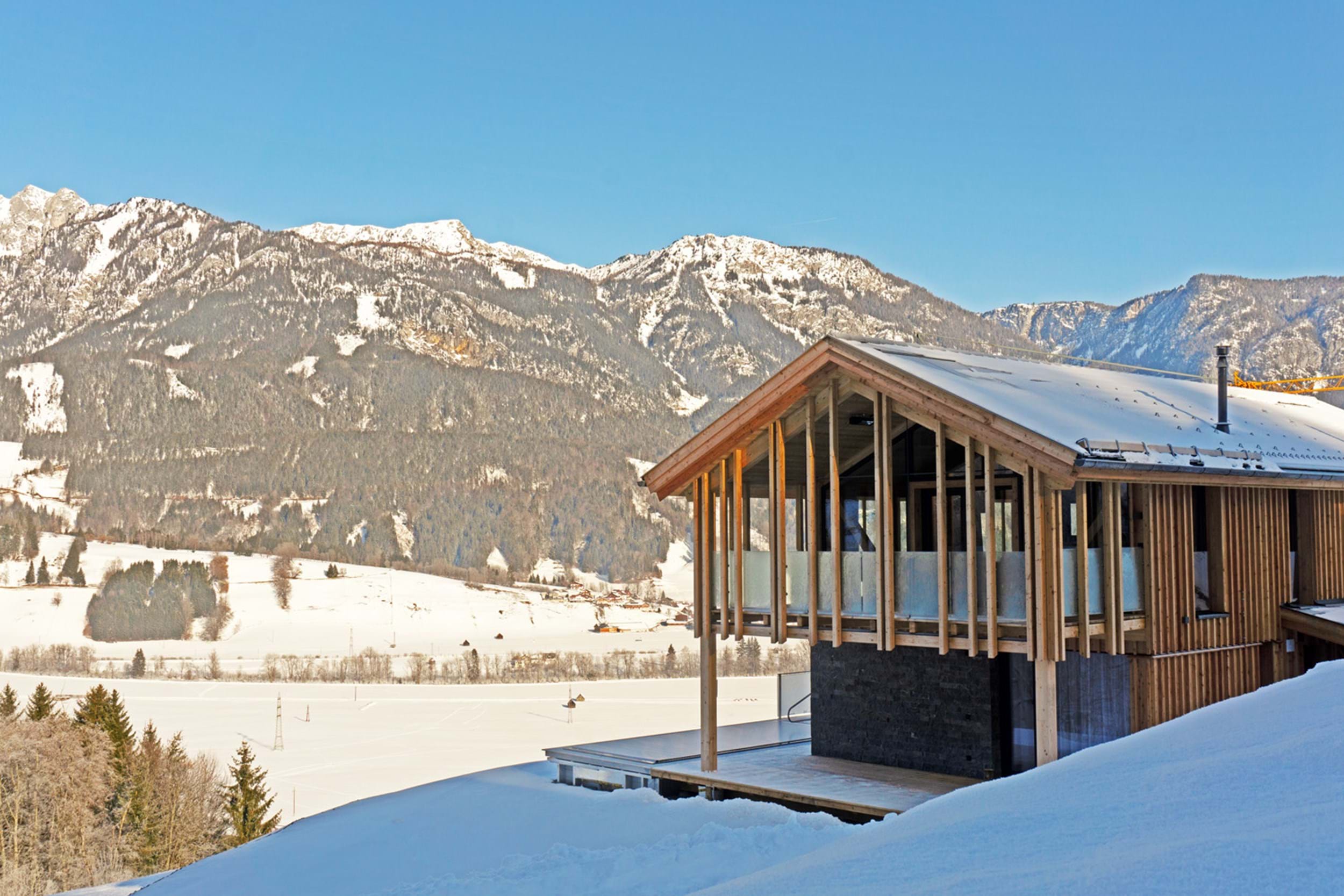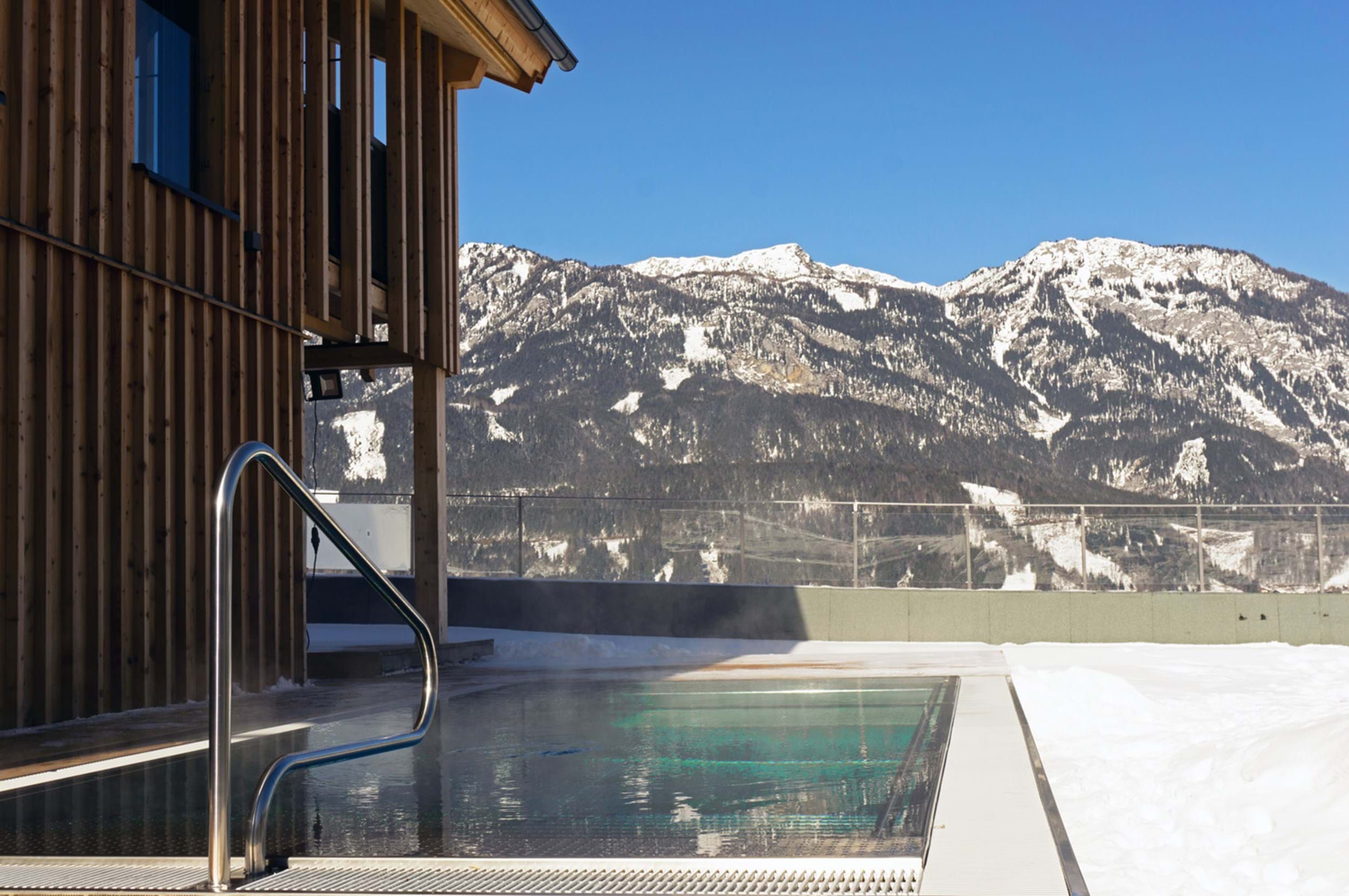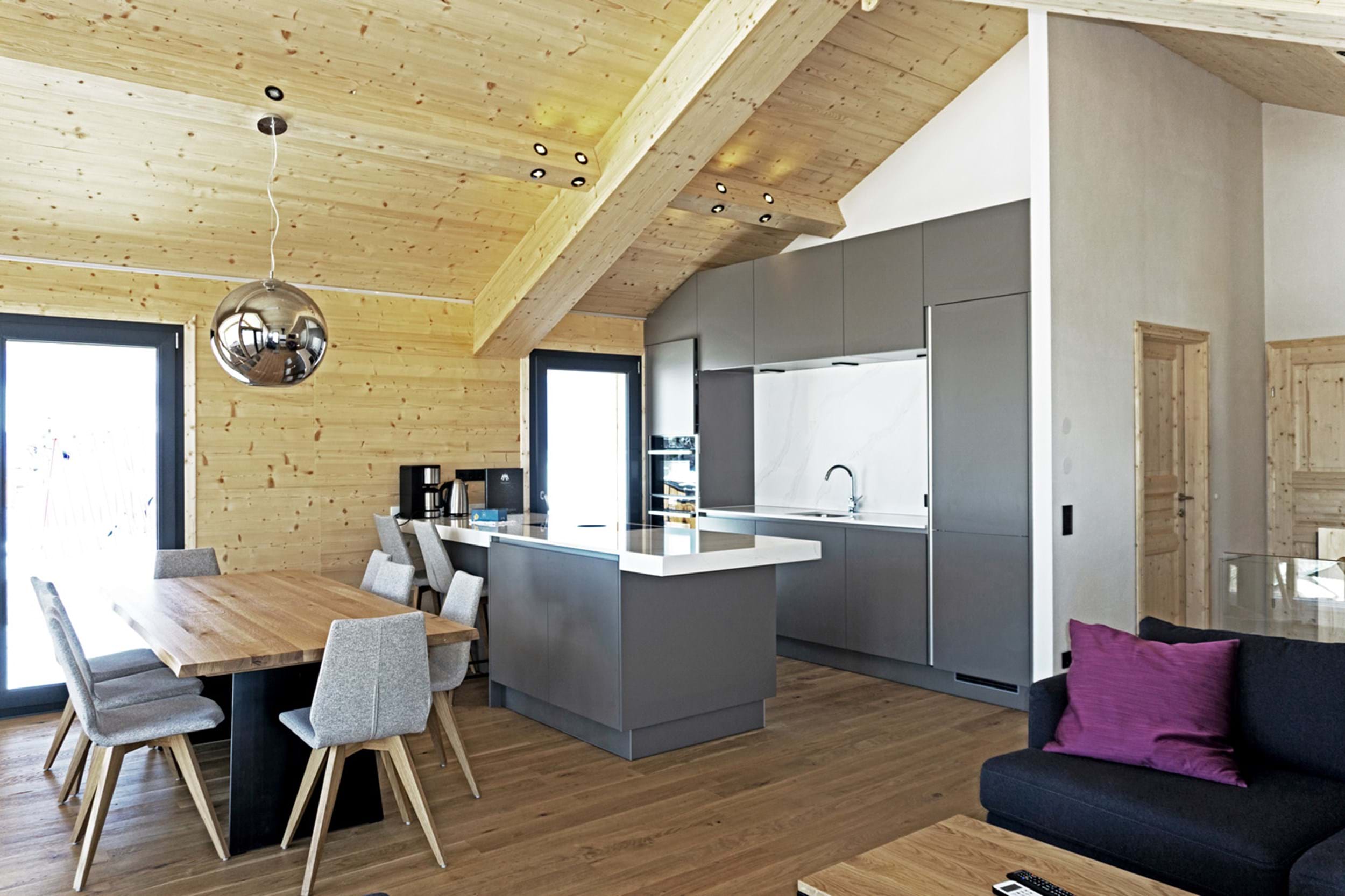 2. Chalet Dachstein: 150m2 stor Chalet til i alt 10 personer. Fem soveværelser, hver med dobbeltseng. Seks badeværelser, hvoraf et med sauna, samt et separat toilet. Stort fuldtudstyret køkken/alrum samt udendørs terrasse med egen opvarmet po