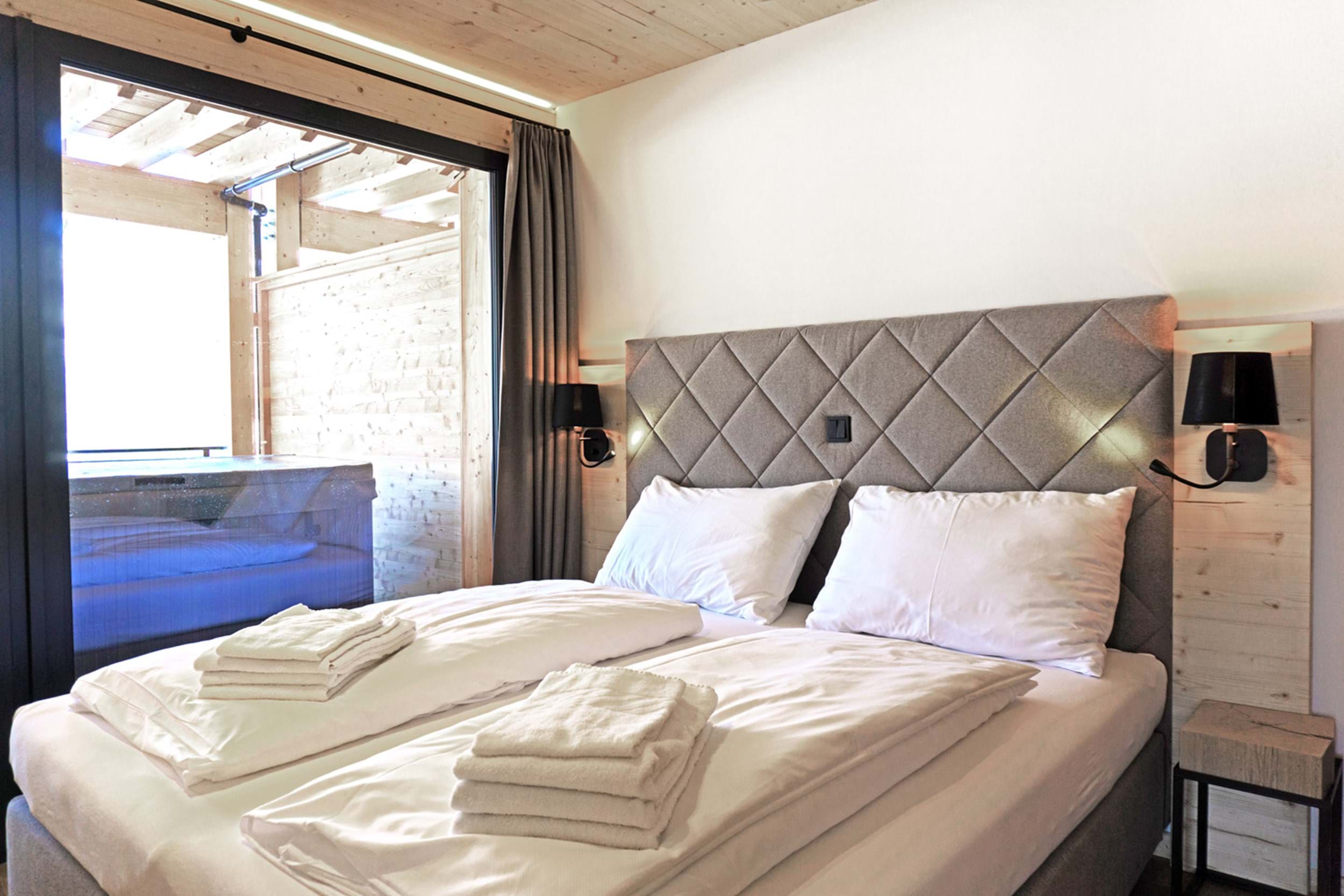 Chalet med fire separate soveværelser - tre med dobbeltseng, et med dobbeltseng samt køjeseng. Fire badeværelser, hvoraf et med sauna, samt to separate toiletter. Stort fuldt udstyret køkken samt udendørs terrasse med egen jacuzzi.