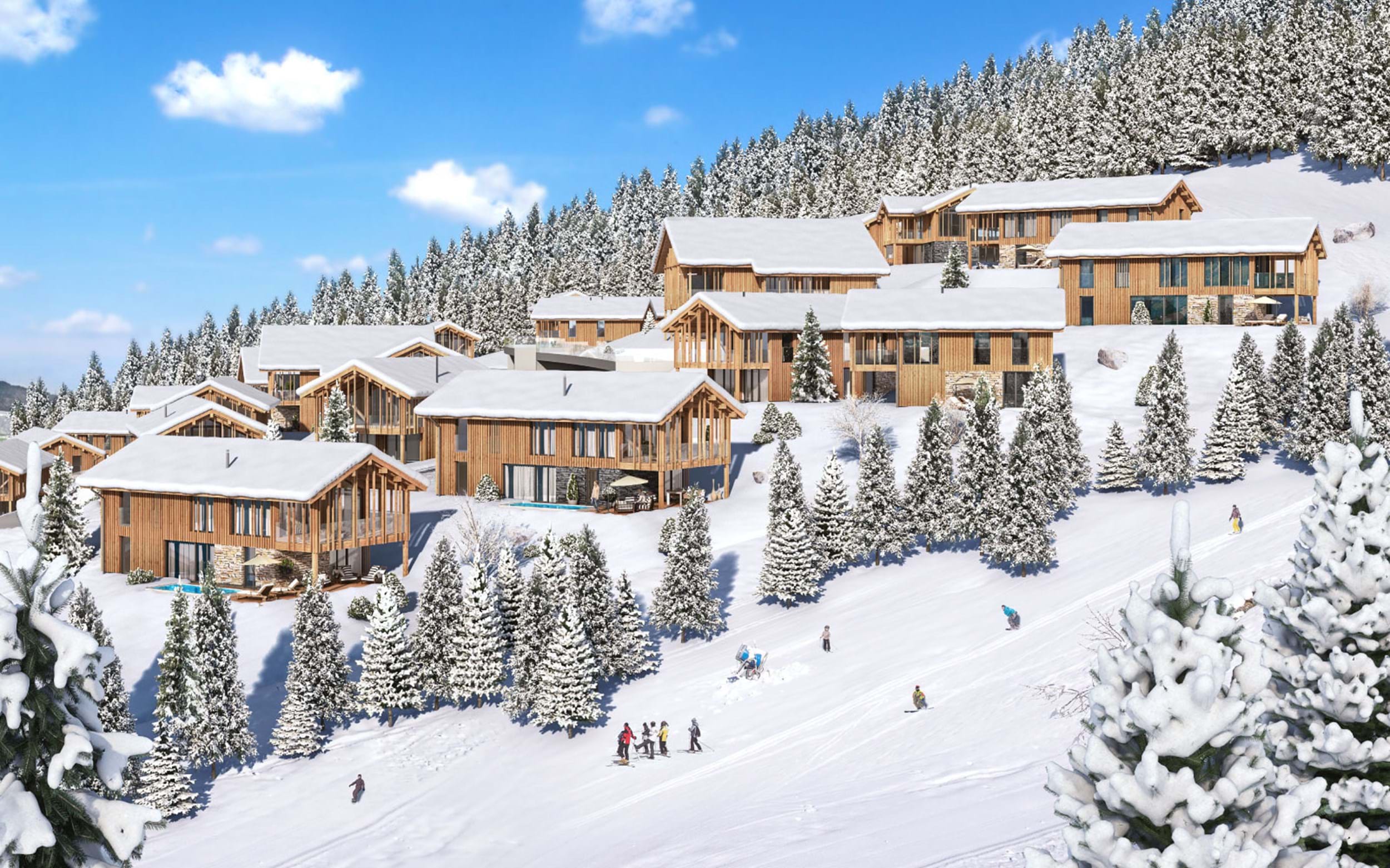 Bemærk nogle af SNE & SNÖ's udendørsbilleder er animationsbilleder af, hvordan de forskellige chalets kommer til at se ud. Der kan derfor forekomme små byggeændringer i forhold til det færdige produkt.