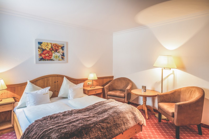 DELUXE værelserne tilbyder komfort for par i alle aldre. Hyggeligt med god atmosfære. Et lille ekstra siddeområde i rummet giver plads på værelset. Værelserne er sydvendte med balkon. Udsigt over Rendl-bjergene, Sattelkopf og St. Anton.