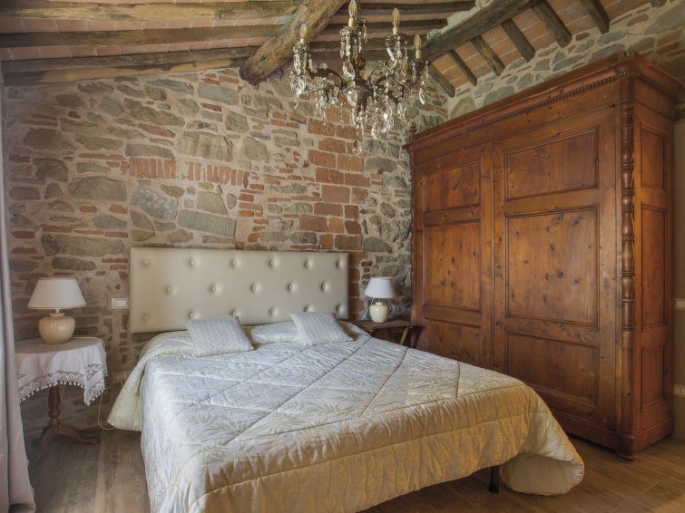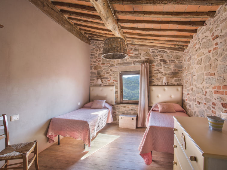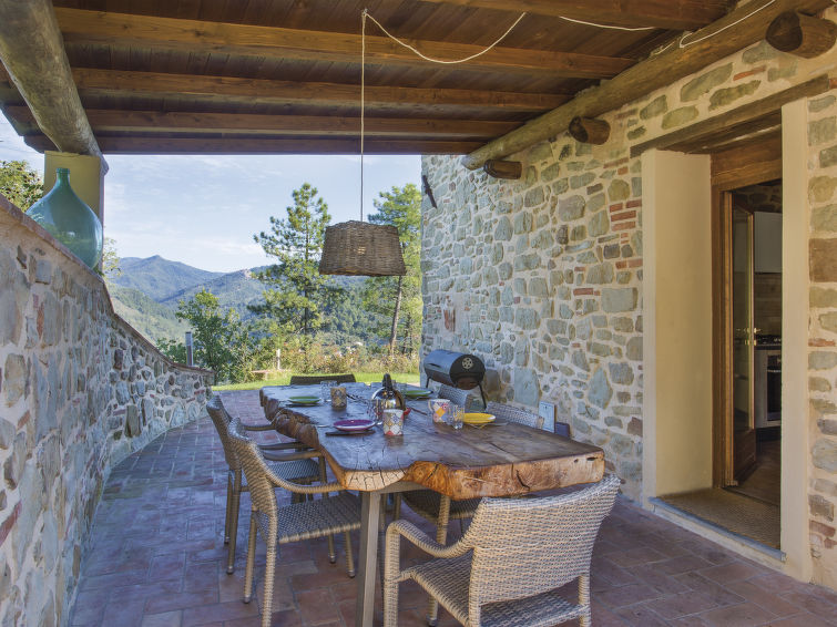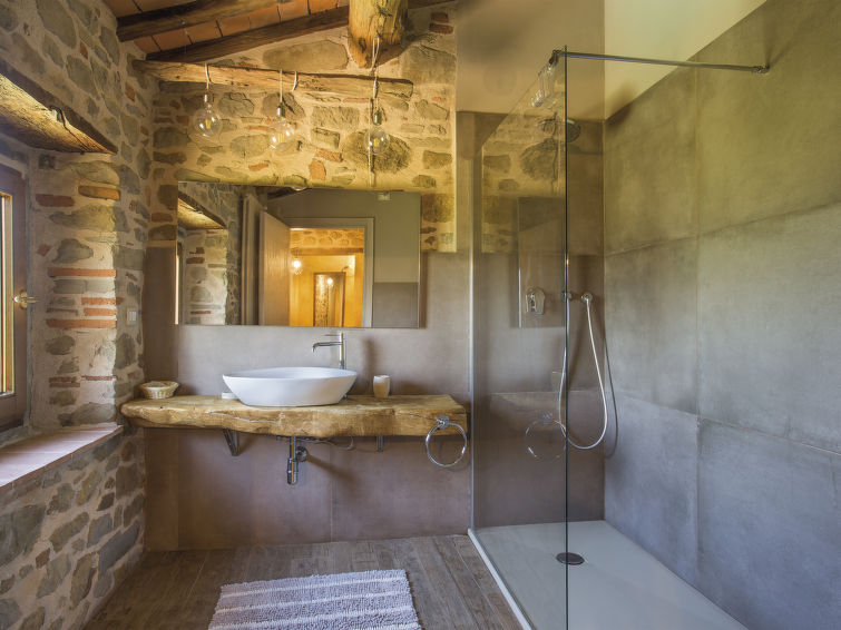Dejlig restaureret italiensk landejendom smukt beliggende på skråning for enden af blind stikvej med fantastisk udsigt til dale, bjerge og små byer. Adgang / parkering: ca. 1,1 km, smal snoet vej. Mulighed for parkering af op til 5 biler på ejendommen. Til ejendommen hører desuden: ca. 500 m² (hele ejendom 5 ha), åben grund (elektrisk indgangsport), græsplæne, oliventræer, skov. Havevedligeholdelse forestås af ejeren. Udendørs faciliteter (privat brug): terrasse 15 m² (overdækket), reserveret åbent rum, møblering til rådighed, lounge møbler, transportabel grill. Pool (privat brug): 10,0 x 7,0 m, 1,50 m dyb, 02.05.20-03.10.20, pleje af saltvandspool. Pool område: flisebelagt, græsplæne til solbadning, liggestole, parasol. Wellness: privat brug (gratis): boblebad. privat brug (gratis): infrarød sauna. Vigtig information: Boblebadet er tilgængeligt fra 1. september til 3. november.
