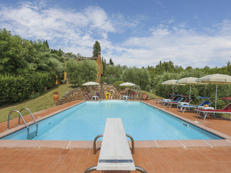 Villa Carandello er en dejlig landejendom smukt beliggende med panoramaudsigt til omgivelserne. Adgang / parkering: parkering på ejendommen. Have (privat brug): ca. 1000 m² (hele ejendom 4 ha), lukket grund (hegn, elektrisk indgangsport), beliggende på en bjergskråning, velplejet have, oliventræer. Udendørs faciliteter (privat brug): terrasse (overdækket), møbleret veranda, transportabel grill, pizzaovn. Pool (privat brug): 12,0 x 6,0 m, 1,30 - 3,50 m dyb, 28.03.20-10.10.20. Pool område: flisebelagt, liggestole, parasoller, udvendigt brusebad. Sportsfaciliteter / fritid: privat brug (gratis): bordtennisbord, legesager til børn. ● Afstande: Marti ca. 1 km. Montopoli i ca. 5 km. Pisa i ca. 35 km. Nærmeste indkøbsmulighed (Marti) ca. 1,8 km. Togstationen San Romano på ca. 8 km. Lufthavn Pisa i ca. 42 km. Hav i ca. 40 km. Sandstrand i ca. 40 km. Golfbane San Miniato (9-hullers golfbane) i ca. 20 km (Fontevivo).