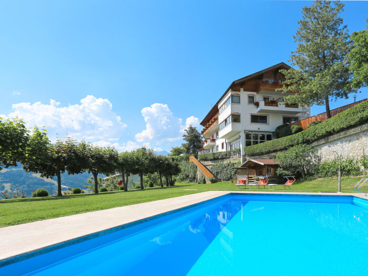 Dejlig ejendom med 13 lejligheder beliggende i udkanten at byen med skøn udsigt over dalen. Ejendommen har en velholdt græsplæne, en dejlig pool på 10 x 5 meter (åben i perioden 16/5-27/9), solstole og bordtennis. Der er elevator i ejendommen. Nærmeste supermarked er kun 100 meter væk og der er ca. 20 km til Brixen og 30 km til Bolzano.