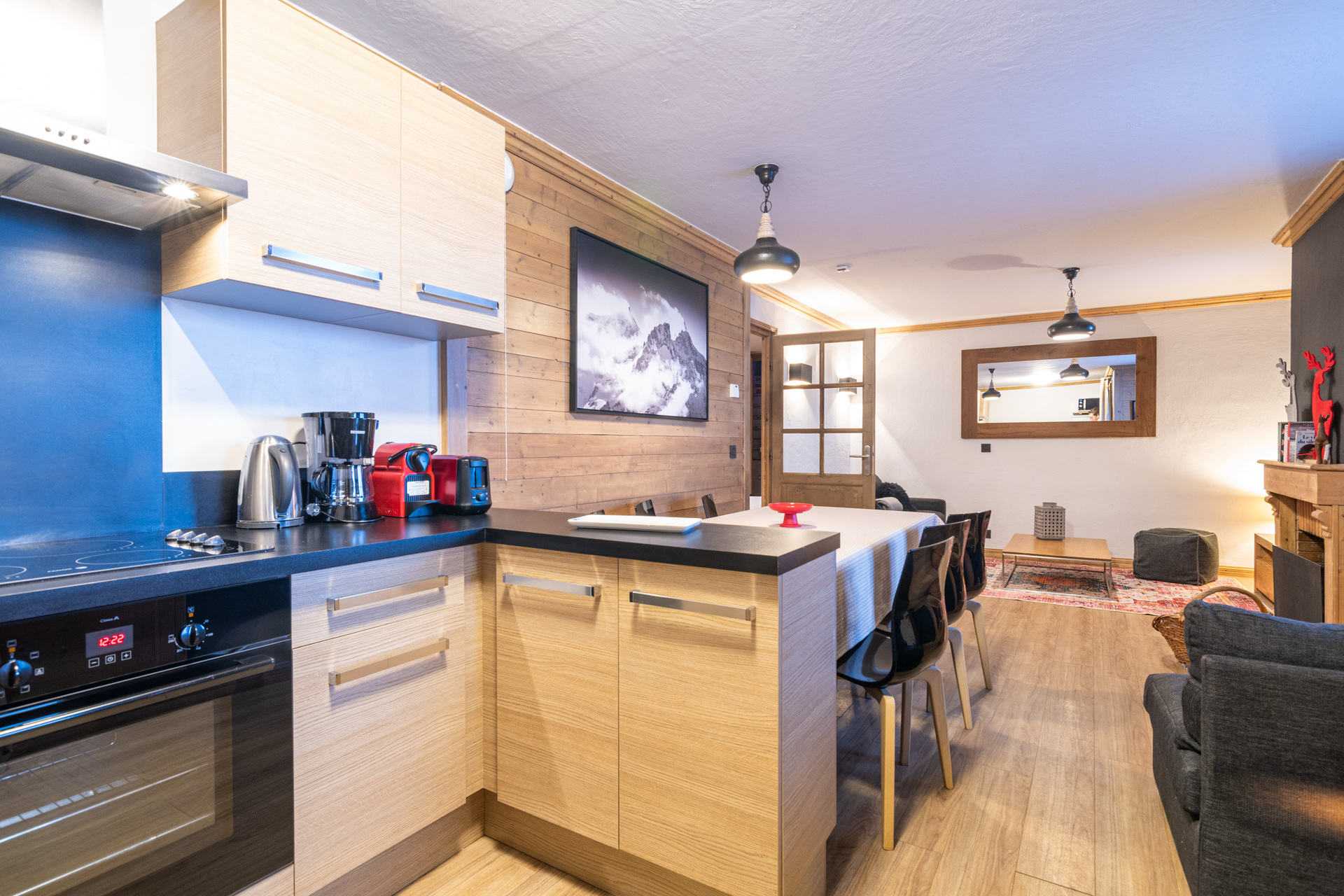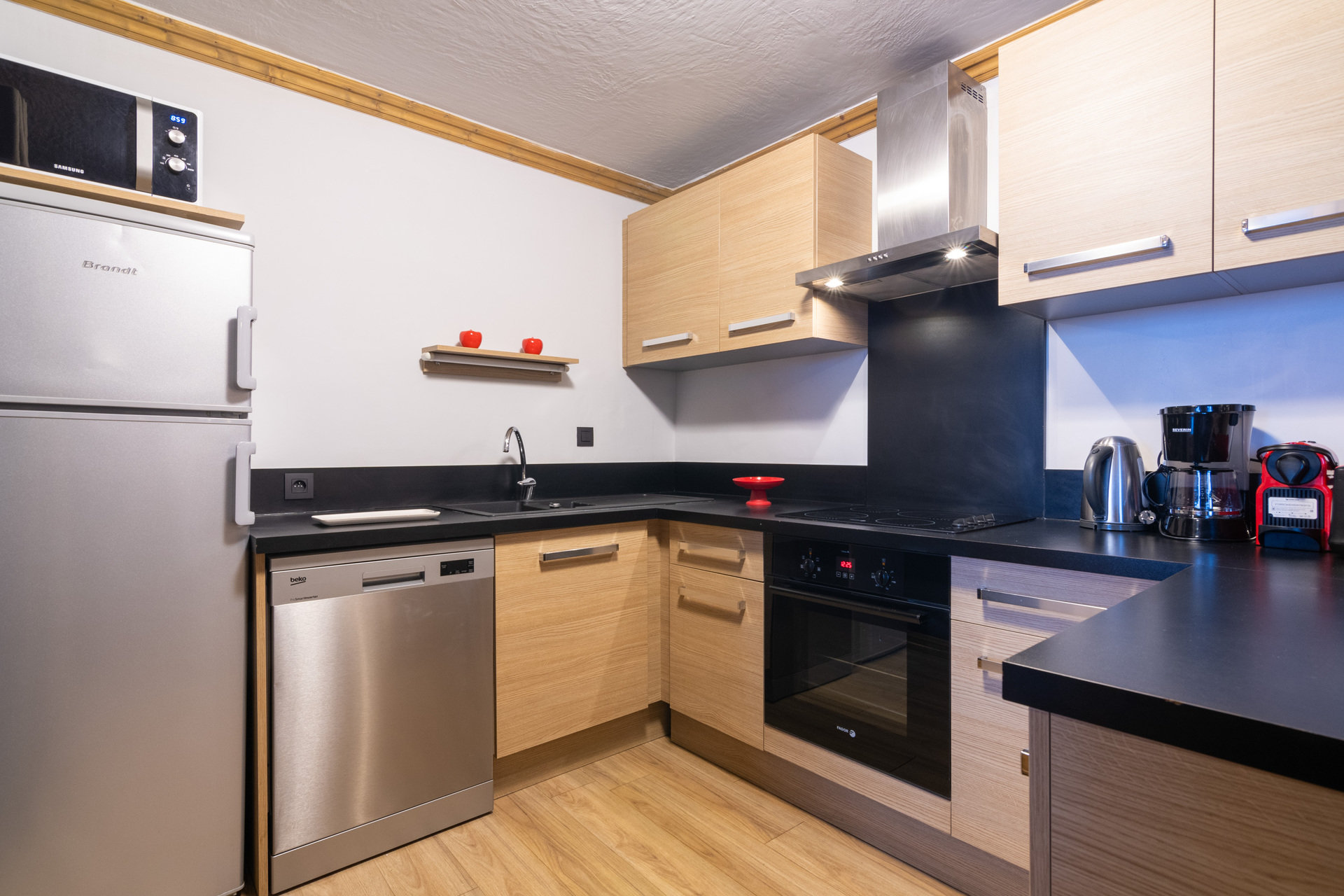 Det rummelige køkken fungerer som et naturligt samlingspunkt og indeholder ovn, vaskemaskine, køleskab samt masser af skabsplads. Plads er i det hele taget nøgleordet i de to smukke chaletter, hvor der er plads til skitøj og udendørs fodtøj i entréen. Der er ligeledes skiskabe til samtlige lejligheder, og flere indeholder støvlevarmere, så støvlerne kan tørre natten over.