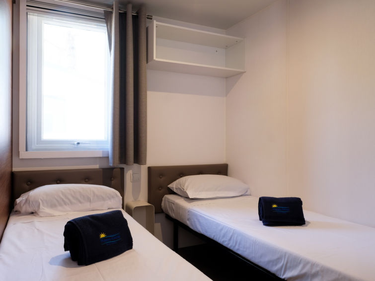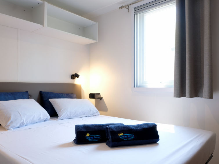 4-værelse-campingvogn 30 m2 til 7 personer. Indrettet med stue/soveværelse med 1 sovesofa, spisebord og klimaanlæg. 1 værelse med 1 fransk seng (140 cm). 2 værelse, alle værelser med 2 senge (70 cm). Åbent køkken (4 kogeplader, mikroovn, fryser, elektrisk kaffemaskine). Brus/WC. Opvarmning. Terrasse 9 m2 delvis overdækket. Havemøbler, elektrisk grill, liggestole (2). Til benyttelse: højstol. Bemærk venligst: ikke-ryger lejlighed.