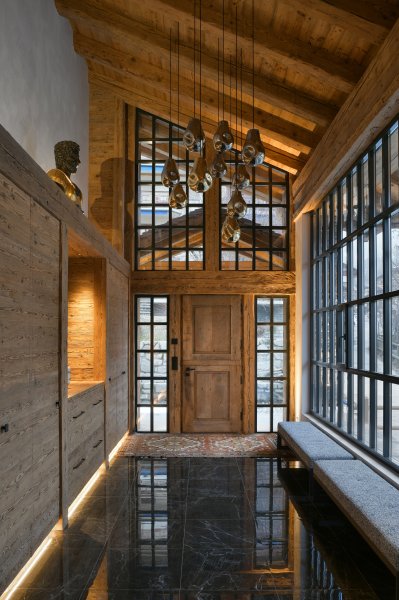 On entering the chalet through the double height main entrance hall of the chalet you are immediately struck by the elegant and sophisticated feel and look of the property. Striking pendant lighting and Crittall style floor to ceiling windows flood the entrance with light.
