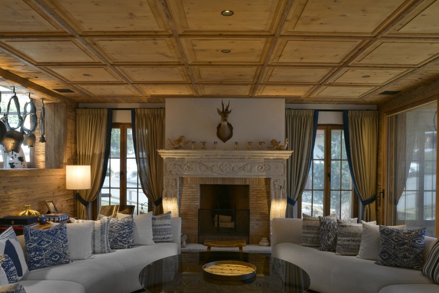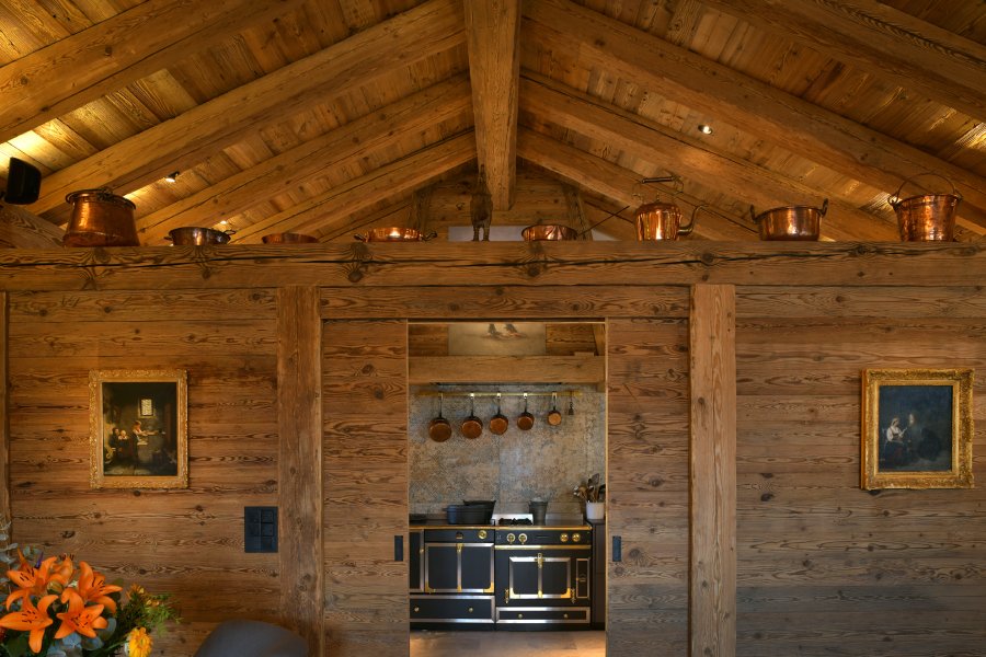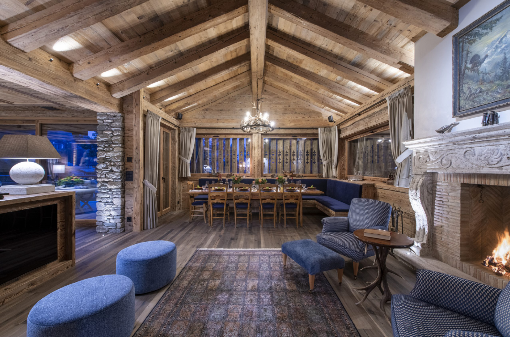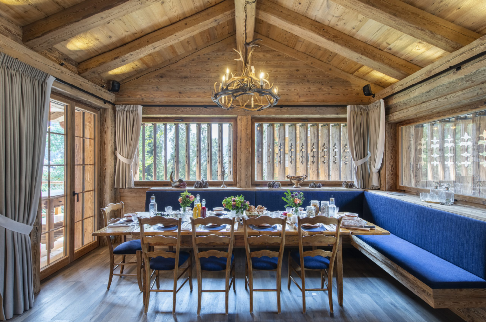 The entrance hall leads you to the elegant open plan kitchen, living and dining area situated on the first floor. The expansive living room is a sophisticated and stylish combination of traditional craftsmanship, plush furnishings and chic finishings. A pair of sumptuous curved sofas surround the central fireplace, ideal for sipping champagne whilst soaking up the alpine atmosphere. The dining room sits adjacent to the living area and caters for glamorous evening meals with a dining table that can seat up to 12 guests. The second fireplace sits next to the dining area and is the perfect spot for post dinner fireside drinks. The impressive kitchen is also on this floor, double doors mean one side can be closed off while guests are enjoying dinner. There is a pantry and staff entrance off the kitchen too.