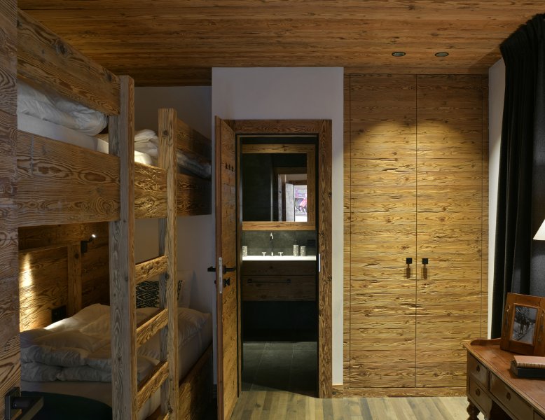 Moving downstairs there is an enchanting quad bunk room, the ideal bedroom for children, with en-suite bathroom. The custom-built bunk beds with traditional wood finish give the cosy, alpine feel you would hope for from a children’s bedroom.