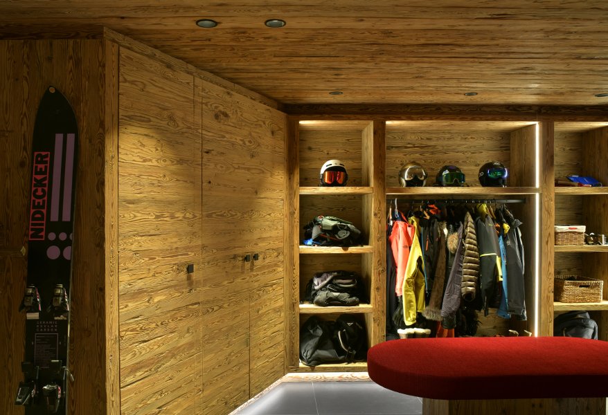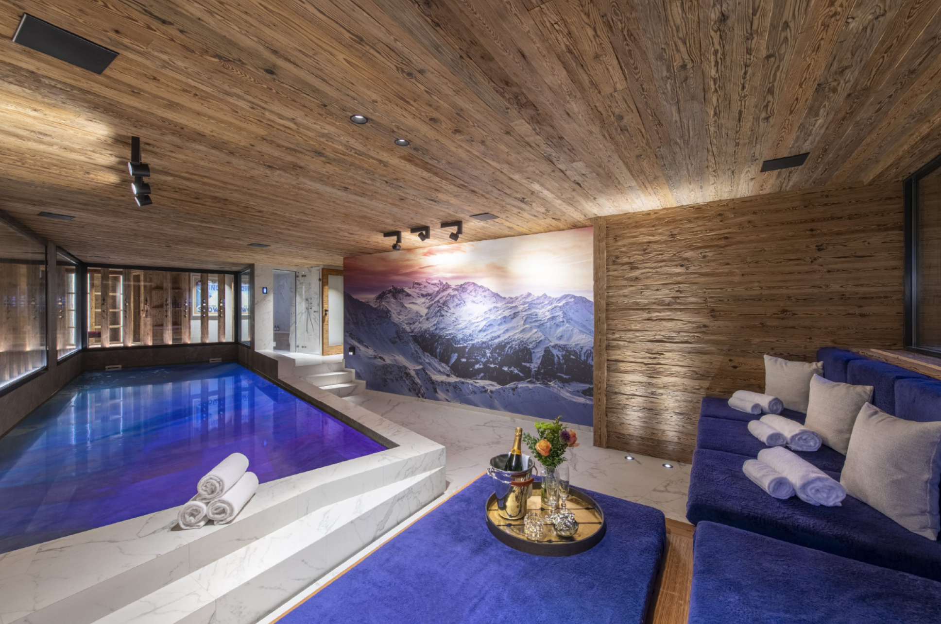 The wooden staircase then leads you down to the chalets impressive spa and indoor swimming pool. The spa is a haven of tranquillity and relaxation, where you can revive tired limbs, soak in the pool or unwind in the hammam. The corner seating and custom built loungers, are the ideal spot to relax with a book. The dedicated cinema room is also on this floor, perfect for movie nights. There are a further two double bedrooms on this floor, one with en-suite bathroom and the second with en-suite shower room. Finally the stylish ski room can be found here, complete with plenty of storage for all your ski equipment and boot warmers. You can exit through the ski room too, and make your way to the slopes.