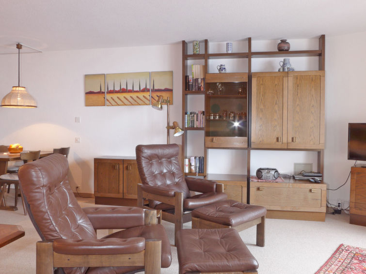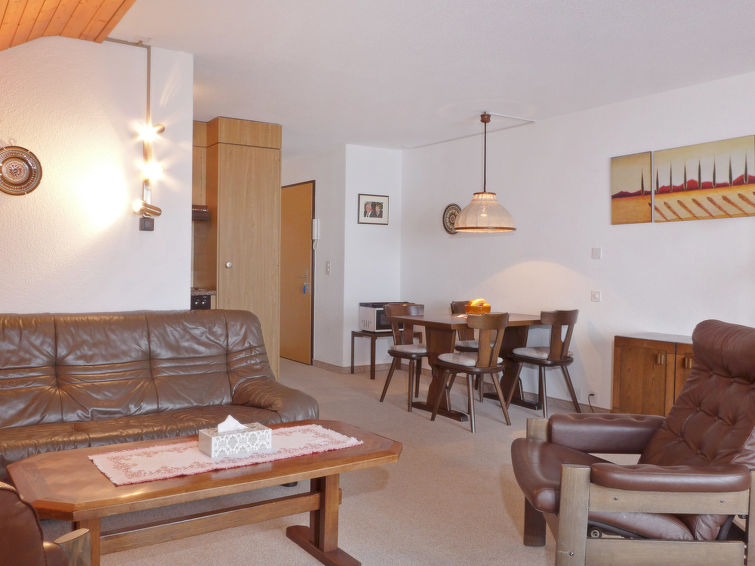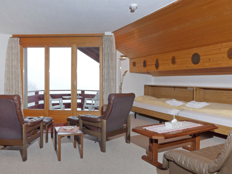 Lejlighed på ca. 70 m2 beliggende på 4. etage. Der er delvis skråvægge og en hygge indretning. Lejligheden består af køkken, stue/spisestue, et soveværelse og et badeværelse. Der er 4 sengepladser i lejligheden. Køkkenet har de mest almindelige køkkenredskaber, ovn, mikrobølgeovn, Nespresso kaffemaskine med kapsler og fonduesæt. I stuen/spisestuen er der to vægklapsenge (90x200 cm), TV, CD og DVD-afspiller. Badeværelset har særskilt toilet og bad/brus/WC samt hårtørrer. Derudover har lejligheden altan med havemøbler og en skøn panoramaudsigt over bjergene.